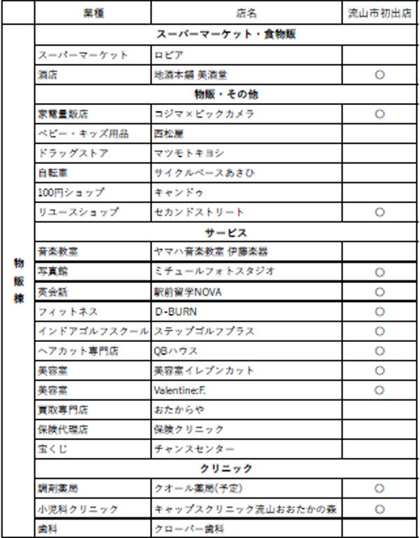 物販棟には、食品スーパー「ロピア」と家電量販店「コジマ×ビックカメラ」を核テナントに、ドラッグストアや100円ショップ、酒店などの物販店舗から、音楽教室や写真館、英会話スクール、フィットネス施設などが出店します。また、飲食棟には回転寿司や焼肉、中華料理など、家族で楽しめる店舗が出店します。