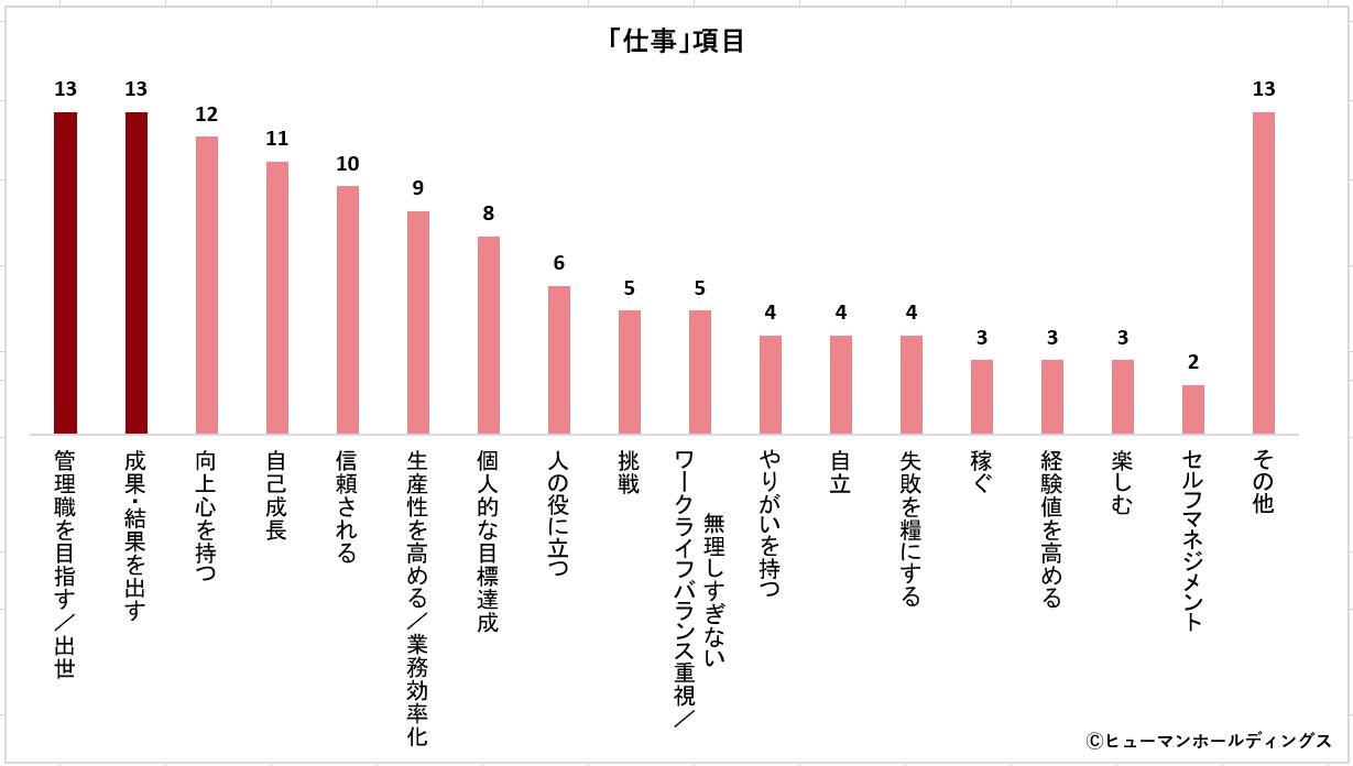 「人生目標」を達成するために必要な8大分野の各項目の中で一様の傾向があったのは「仕事」の項目で、【管理職を目指す/出世】系目標が13名、【成果・結果を出す】系目標が13名で同率1位でした。