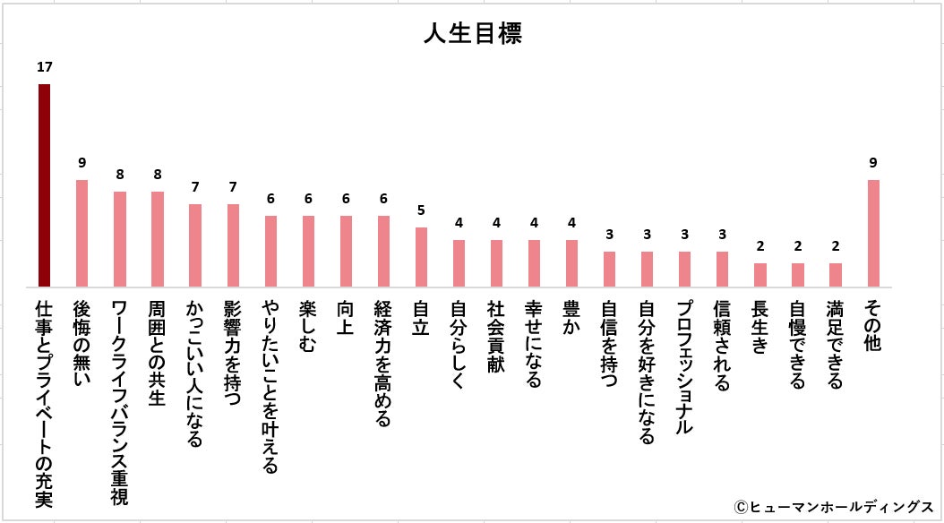 次いで【後悔の無い】系目標(9名)に続き、3番目に多かったのは【ワークライフバランス重視】系の目標(8名)でした。「仕事とプライベートの充実」「ワークライフバランスを重視」する人が多いのは、当社が実施した『Z世代の仕事観と自分らしさに関する調査2024』での【自分らしい働き方は「ワークライフバランスを保つ」「仕事とプライベートをきっちり分ける」が多い】結果と同様の傾向が見られます。