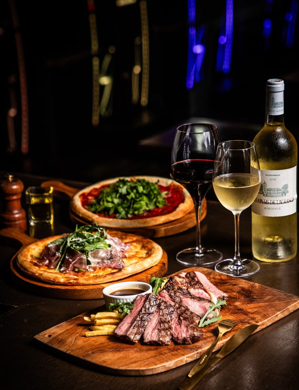 フードの目玉メニューは、オーストラリア産「サーロインステーキ200g」を特別価格1,500円でご提供。加えてハッピーアワー限定メニュー「5種のピザ」は、ハーフ&ハーフでのご注文も可能です。