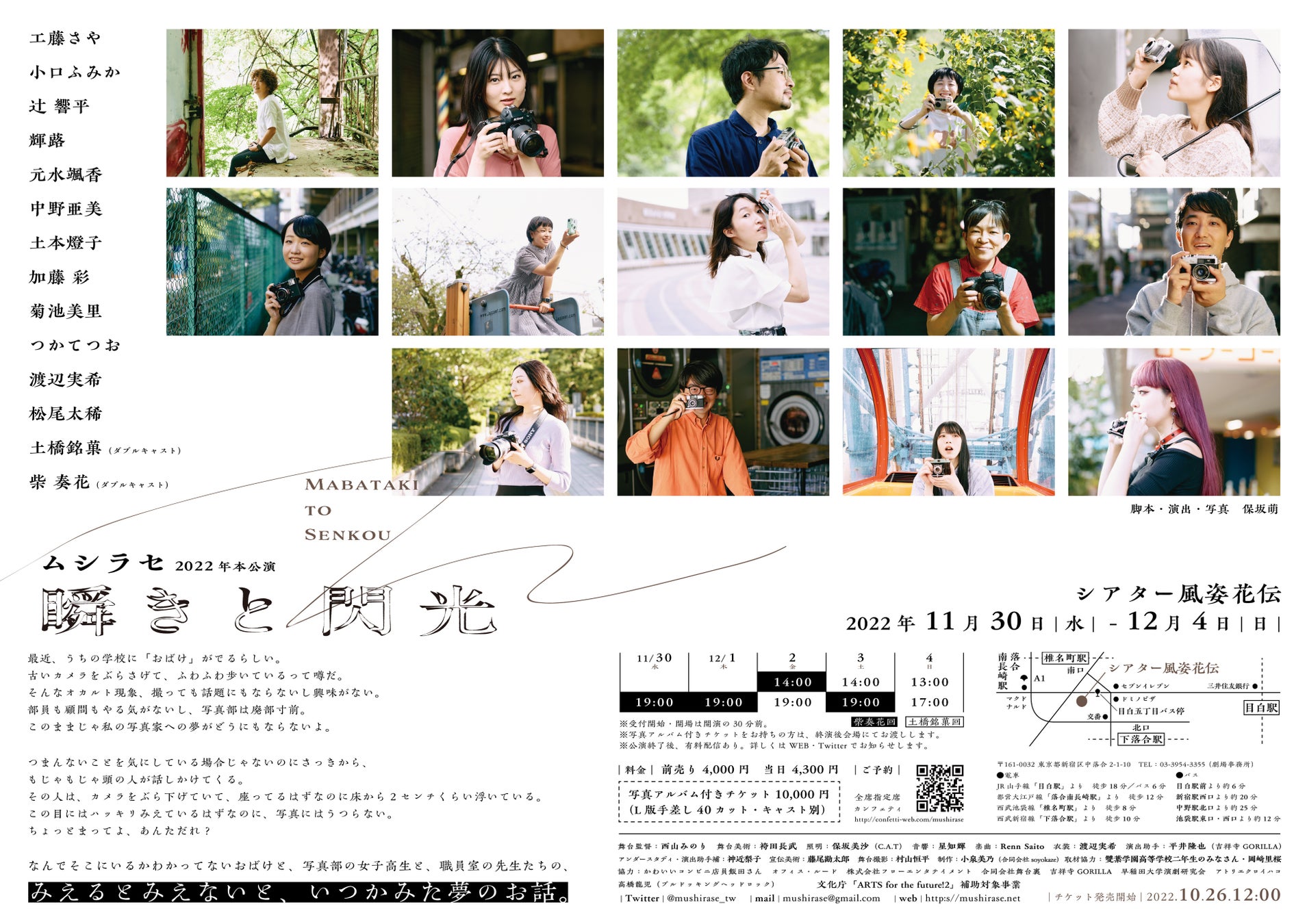 ムシラセ(代表:保坂萌)主催、『瞬きと閃光』が2022年11月30日 (水) ~2022年12月4日 (日)にシアター風姿花伝(東京都新宿区中落合2-1-10)にて上演されます。チケットはカンフェティ(運営:ロングランプランニング株式会社、東京都新宿区、代表取締役:榑松 大剛)にて10月26日(水)12:00より発売開始です。