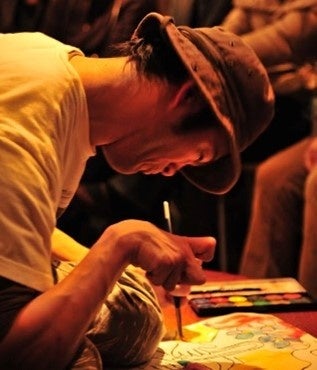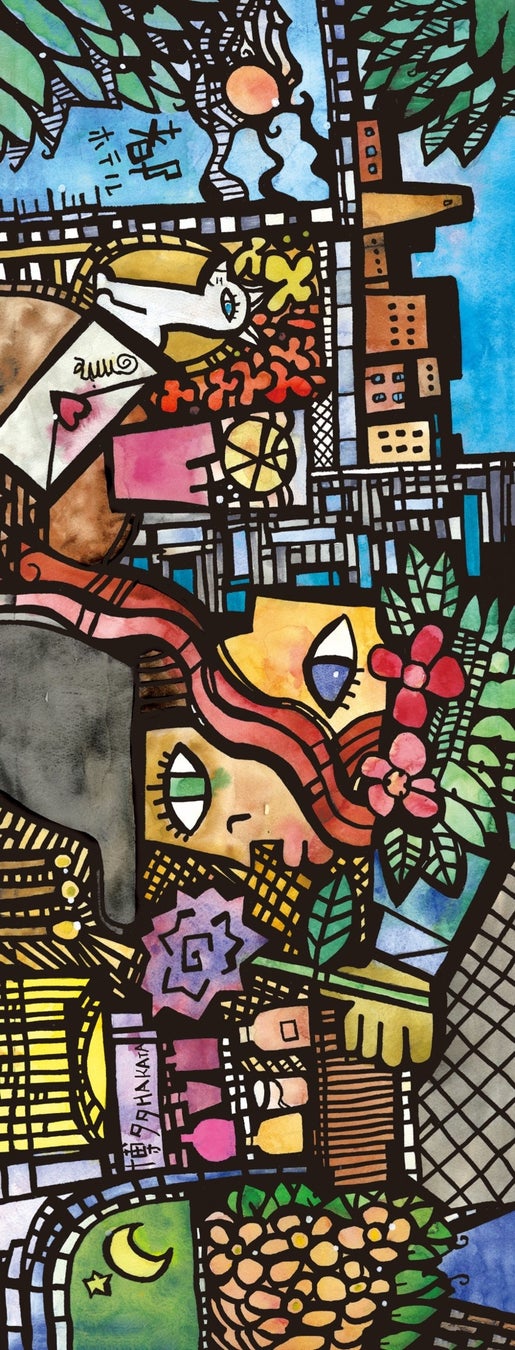 <プロフィール>幻想的な淡い水彩と力強い黒のラインによって、溢れるイメージをコラージュするように仕立てられる。不随意運動を全身の力で抑え込み、筆先の繊細な動きをコントロールする姿と、画用紙に刻々と浮かび上がるイメージには、思わず息をのみ引き込まれてしまう。2019年「ユヌス・ジャパン」のロゴマークを制作。