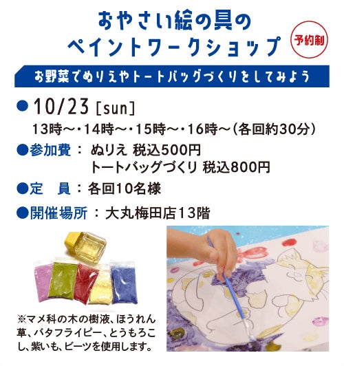特設会場では、大丸梅田店で働く従業員が愛用品を集めたフリーマーケット「大丸蚤市」をはじめ、ハンズ梅田店主催のおやさい絵の具を使ったワークイベントなども開催します。