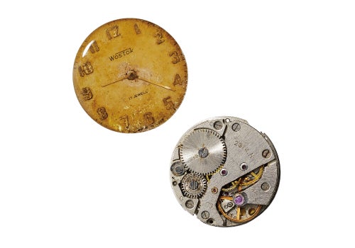 1960年〜80年代に製造された「ねじ巻き式時計」を分解。その文字盤や駆動装置を使って製作しました。(歯車は固定済)
