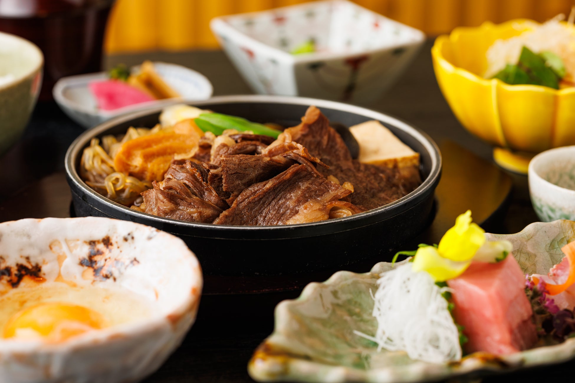 「平川」のすき焼きとお造りのセット、「海彦」の紅白丼、いずれも40周年を記念したメニューです。