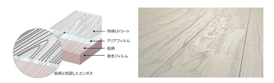 独自のエンボス手法による、柄と同調したエンボス凹凸表現により、耐久性と意匠性を備えた床用化粧シートを実現。