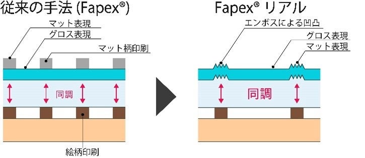 木目などの天然素材を表現した化粧シートにおいては、近年絵柄としてのリアルさだけでなく、その質感の再現が求められています。しかしながら、従来の表面コーティングによるテクスチャー表現(グロスマット)では、繰り返しの摩擦による摩耗を完全に抑えることが難しく、床用途への展開ができませんでした。