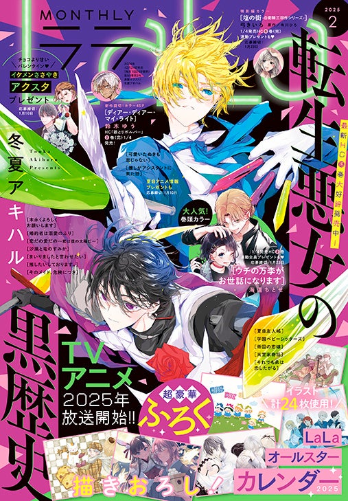 株式会社白泉社(本社:東京都千代田区、代表取締役社長:高木靖文)は、『LaLa』2025年2月号を2024年12月24日(火)に発売しました。TVアニメが2025年に放送決定の「転生悪女の黒歴史」(冬夏アキハル)が表紙で登場です。HC最新2巻が1月4日(土)に発売の「ウチの万李がお世話になります」(海道ちとせ)は初の巻頭カラーで登場。同じく1月4日(土)に発売の「ウチの万李がお世話になります」(海道ちとせ)は初の巻頭カラーで登場。最終6巻が発売される「塩の街-自衛隊三部作シリーズ-」(漫画:弓きいろ 原作:有川ひろ[角川文庫/KADOKAWA刊])と最終2巻が発売される「狼とリボルバー」の作者・鈴木ゆうの新作読切「ディアー・ディアー・マイ・ライト」はカラーつきで登場です!そのほか最新情報も盛りだくさん!
