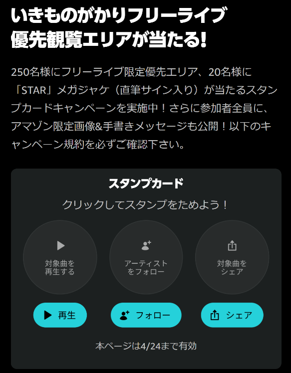 Amazon Music、期間限定のスタンプカード機能を使ったファンとアーティストのつながりを提供する試み「いきものがかりフリーライブ優先観覧エリアが当たる」キャンペーンを本日より開始