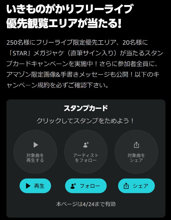 なお、本機能はAmazon Musicモバイルアプリ上でのみご利用いただけます。また、スタンプカード機能はキャンペーン期間のみご利用いただけます。
