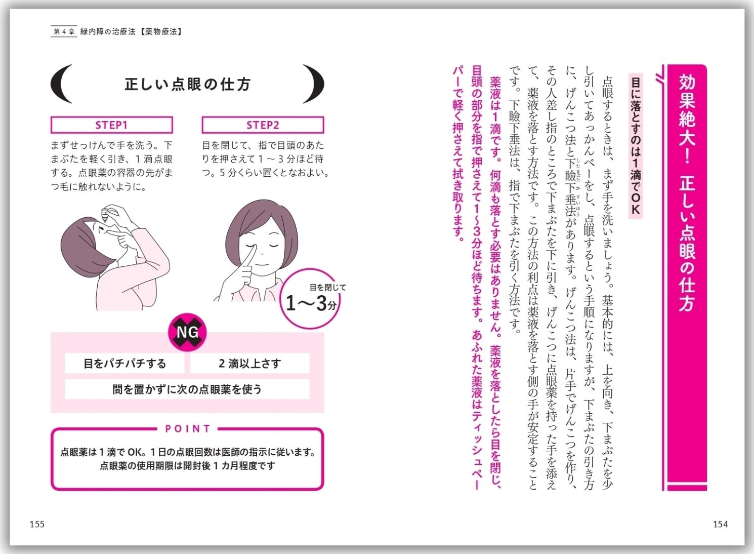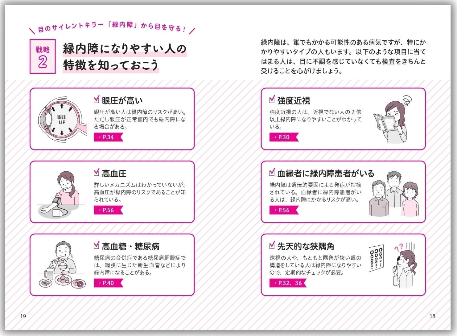 本書では「緑内障になりやすいのはどんな人?」「緑内障になりやすい生活習慣とは?」をはじめ、病気のメカニズム、種類や症状、進行、検査、治療法、症例など、病気を正しく理解するための情報を網羅しています。