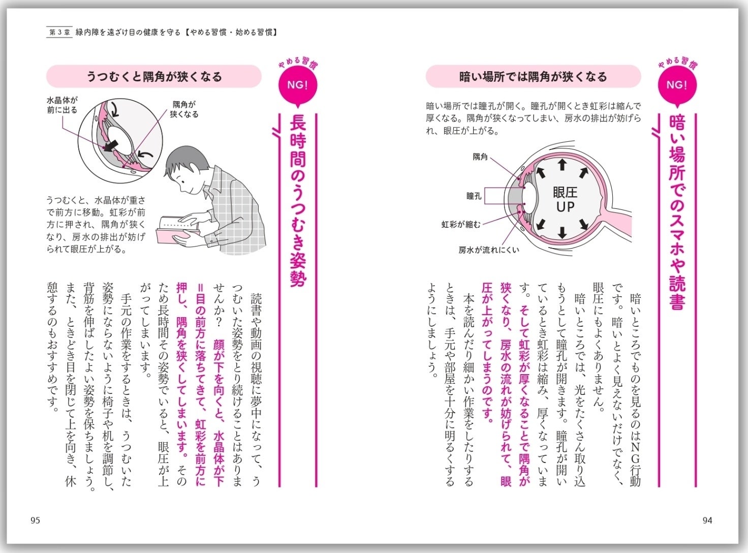 眼圧を下げて視神経を良好に保つ習慣を[始める習慣] 行動編 紫外線をカットする・PC作業中は1時間に1回休憩をとる・ぬるめの半身浴で血流と睡眠の質をUP!/食事編 緑黄色野菜の抗酸化成分で目を元気に・ビタミンAで角膜・網膜の新陳代謝を促進・ビタミンB群で疲れ目を改善し、視力を回復/運動編 1回30分の有酸素運動で血流促進・ストレッチで全身のこりをほぐす ほか