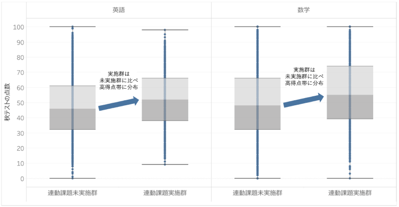 連動課題の有無と秋テストの得点分布(英語、数学)