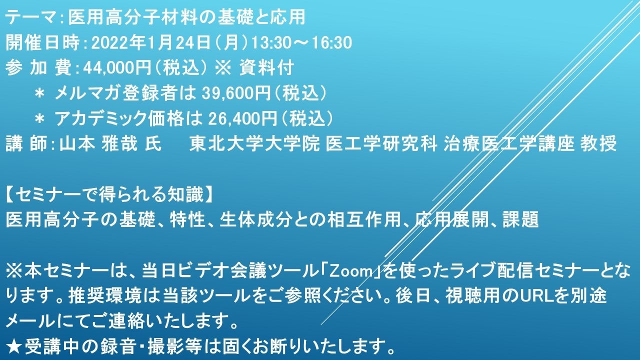 先端技術情報や市場情報を提供している(株)シーエムシー・リサーチ(千代田区神田錦町: https://cmcre.com/ )では、 各種材料・化学品などの市場動向・技術動向のセミナーや書籍発行を行っておりますが、 このたび「医用高分子材料の基礎と応用」と題するセミナーを、 講師に山本 雅哉 氏 東北大学大学院 医工学研究科 治療医工学講座 教授)をお迎えし、2022年1月24日(月)13:30より、 ZOOMを利用したライブ配信で開催いたします。 受講料は、 一般:44,000円(税込)、 弊社メルマガ会員:39,600円(税込)、 アカデミック価格は26,400円(税込)となっております(資料付)。