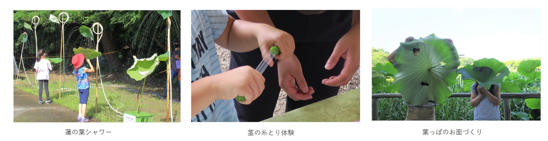 内容 | 蓮の葉シャワー、蓮の糸取り体験、葉っぱのお面づくり、蓮の種・果托のプレゼント(寄付形式)