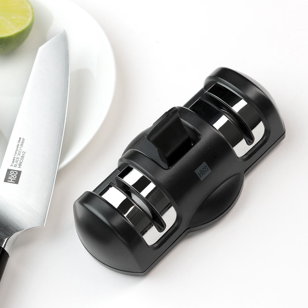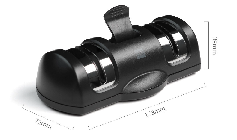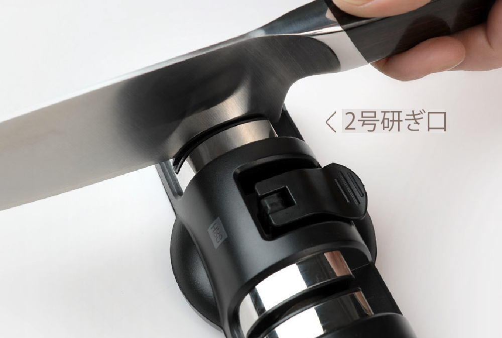 包丁研ぎ器を滑らかな台の上に置き、吸盤で固定します。 もう一方の手でナイフを持ちます。切れ味に合わせて包丁を研ぎます。