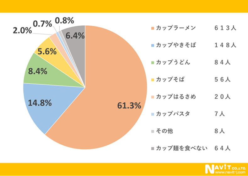 一番食べるカップ麺の種類をたずねたアンケートでは「カップラーメン」が一番多く61.3%でした。次に多かったのが「カップやきそば」で14.8%で3番目は「カップうどん」で8.4%という結果でした。
