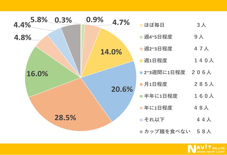 カップ麺を食べる頻度に関するアンケートです。1番多かったのは「月1日程度」で28.5%でした。次に多かったのは「2〜3週間に1日程度」で20.6%、3番目が「半年に1日程度」で16.0%という結果になりました。