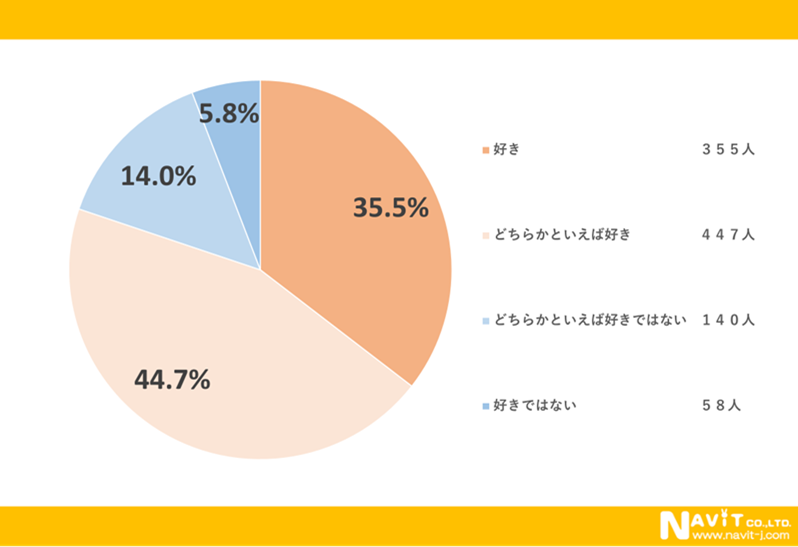 カップ麺が好きですか?というアンケートに対して「好き」と回答された人が35.5%でした。「どちらかといえば好き」という人が44.7%と合わせて80.2%でした。