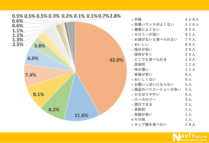 カップ麺のイメージについてたずねたアンケートで一番多かった回答が「手軽」で42.0%でした。他には「保存がきく」で2.5%、「庶民的」が1.1%など様々な答えをいただきました。