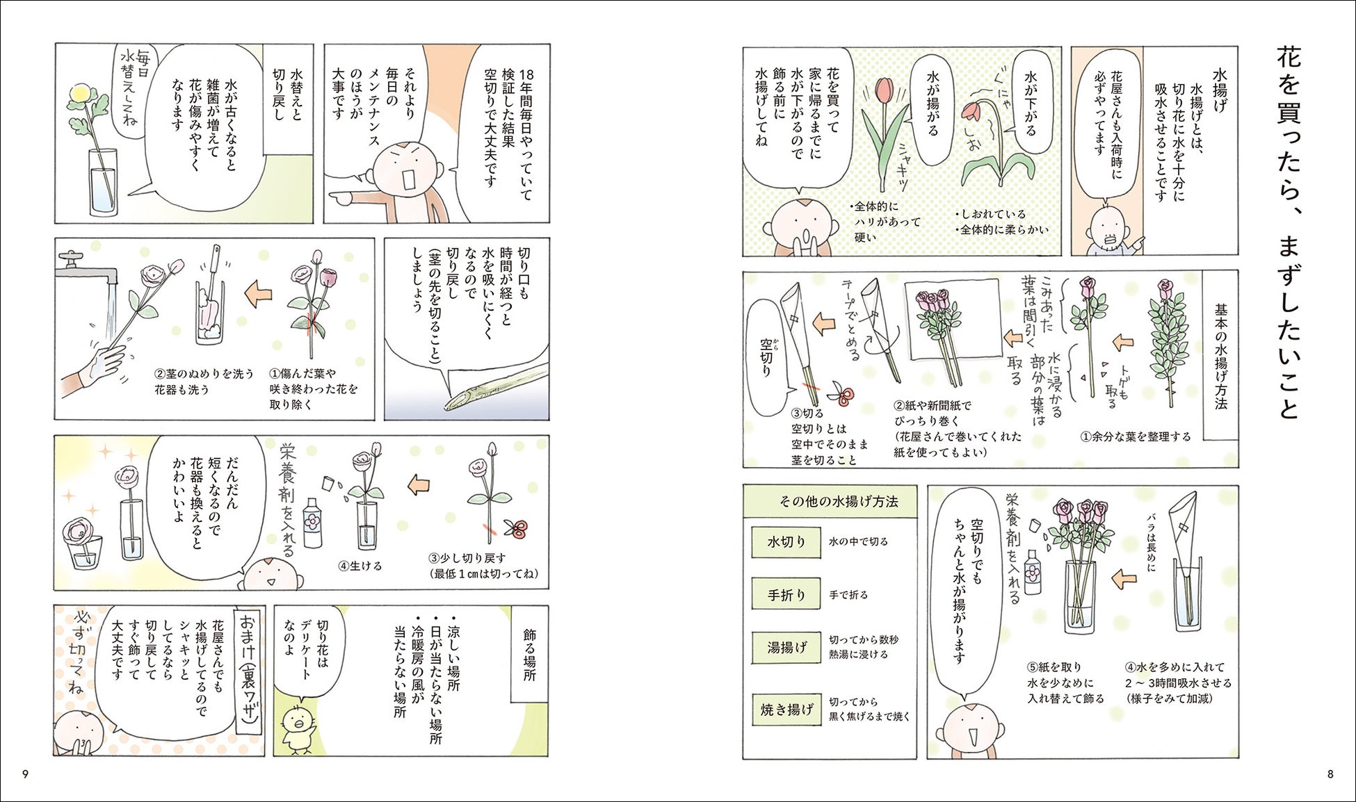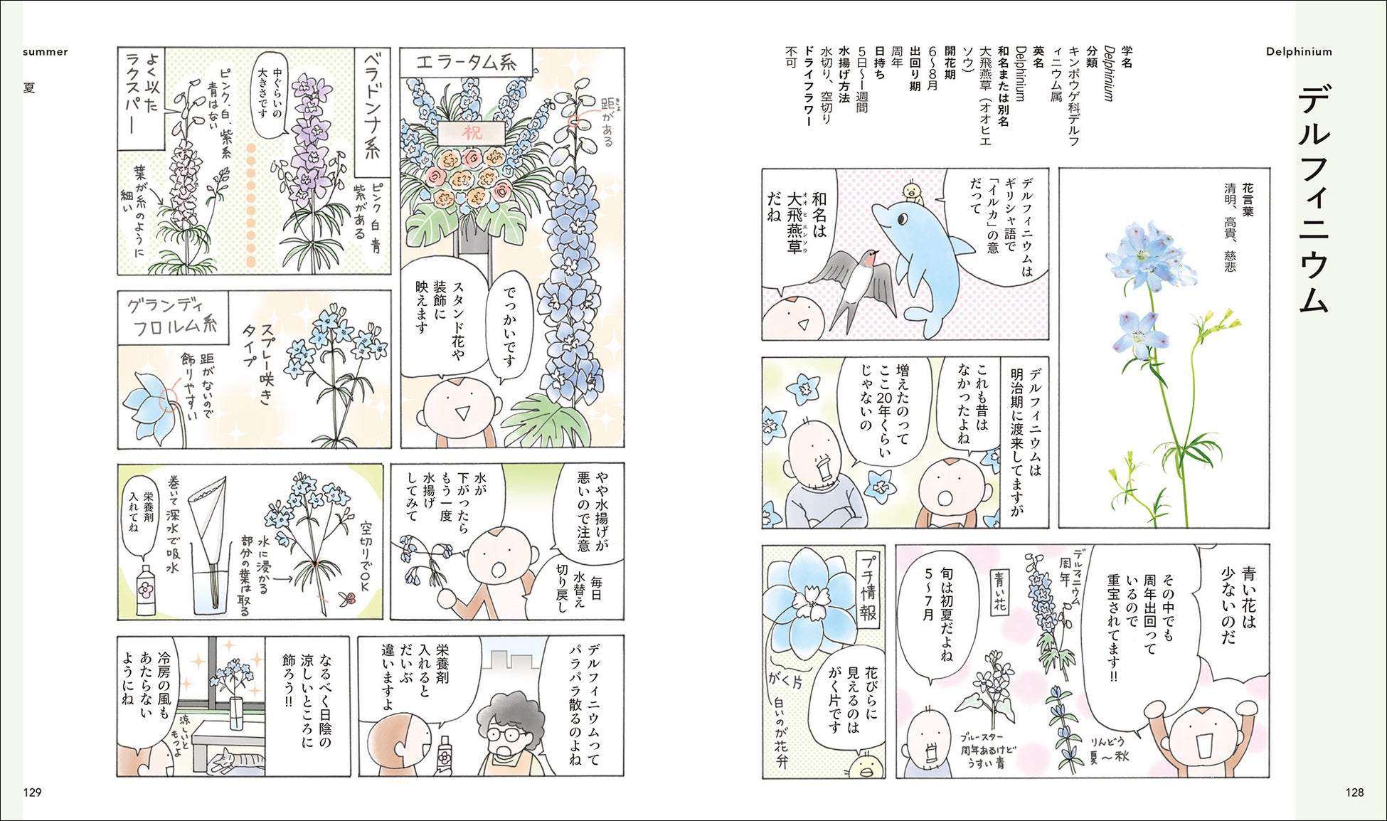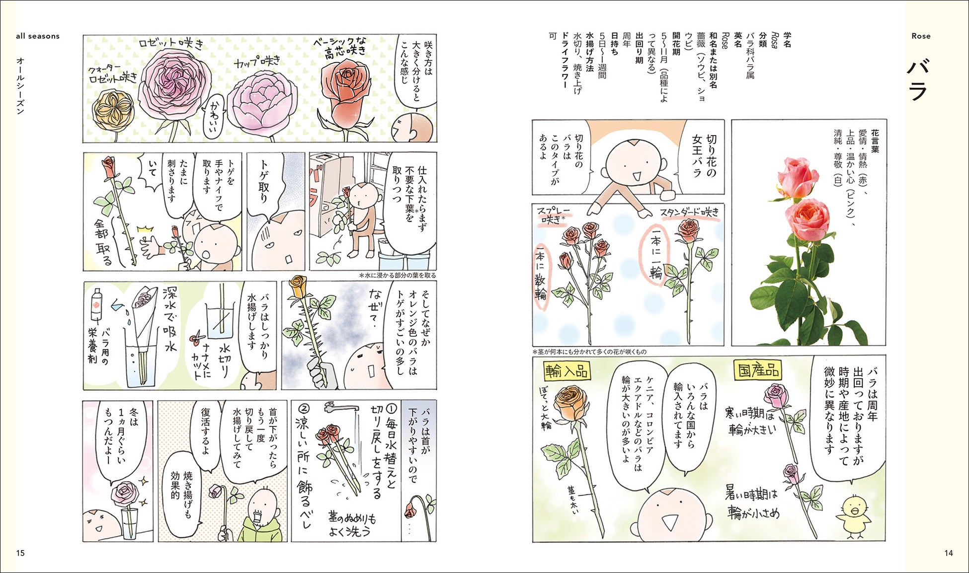 学名の由来から花を長持ちさせるためのケアやコツなど、知識と実用を兼ねた花の情報を、くすっと笑えるコミックエッセイ仕立てで解説します。