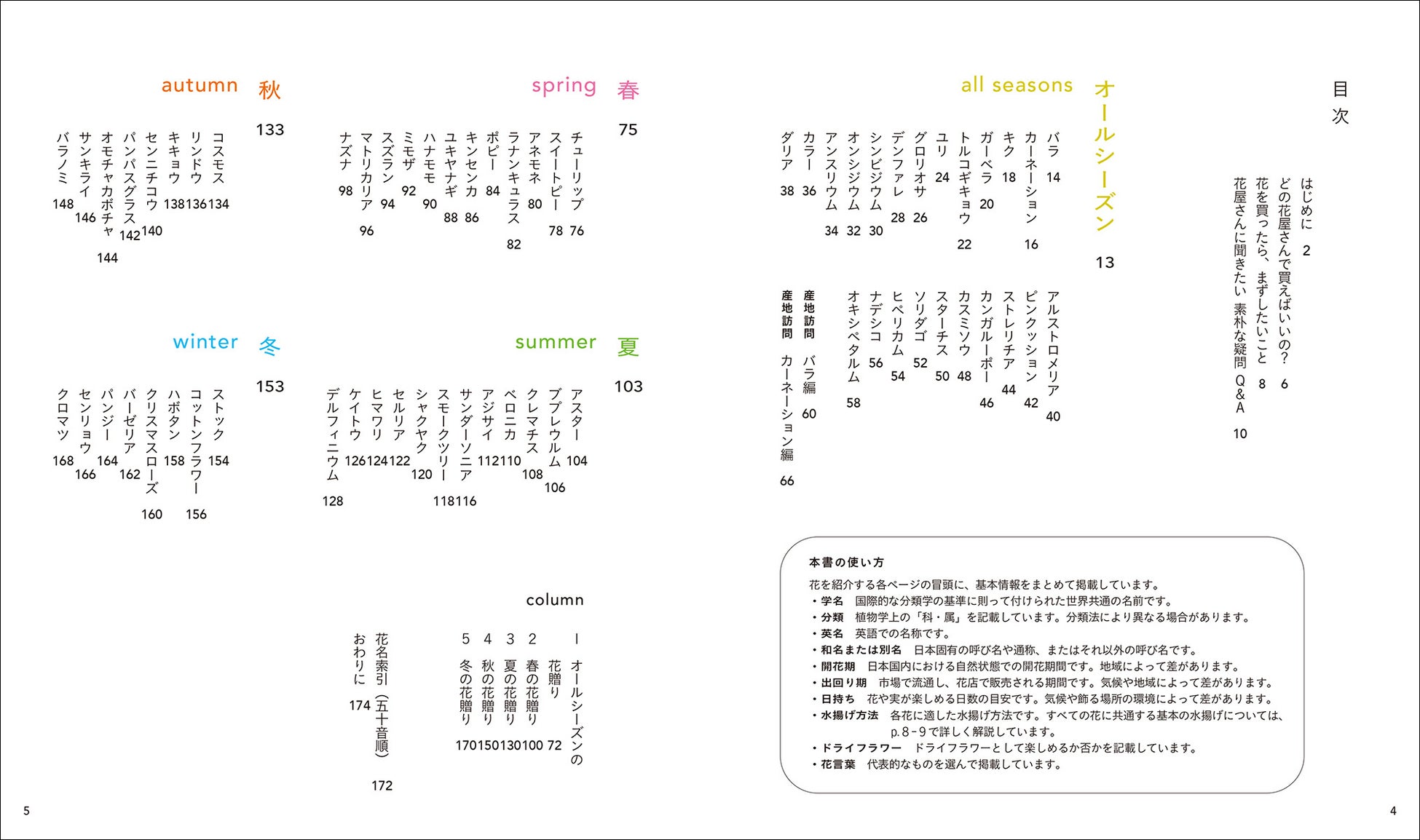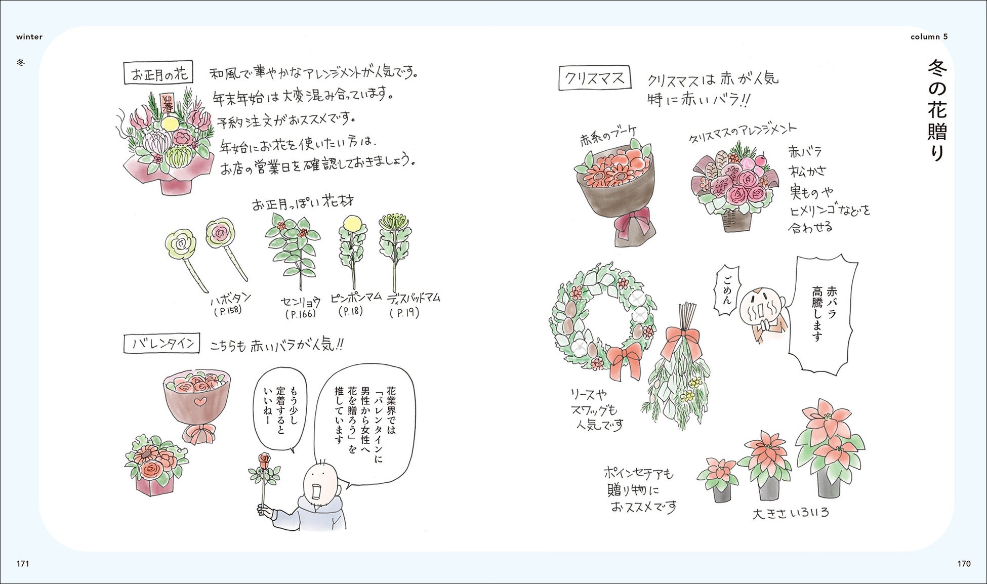 花はオールシーズン+春夏秋冬で章分けし、各章の終わりには、シーズナルギフトとして花を贈る際の豆知識コラムも掲載しています。