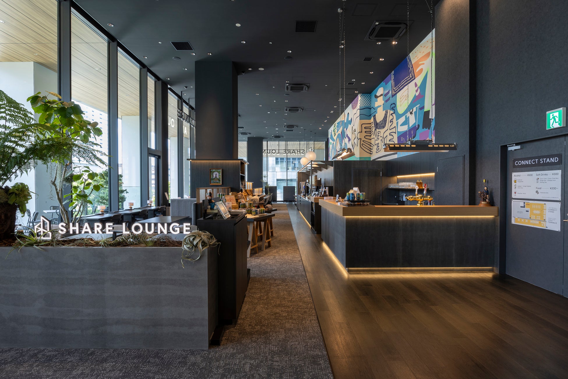本店舗は、SHARE LOUNGEとして初めて、キャッシュ・オン(都度払い)でドリンク・フードを1杯から購入できる新サービス「CONNECT STAND」を展開するほか、開放的な屋外テラスを備え、オフィスでも自宅でも体験できない“ここ”にしかない特別な時間と空間をお楽しみいただけます。