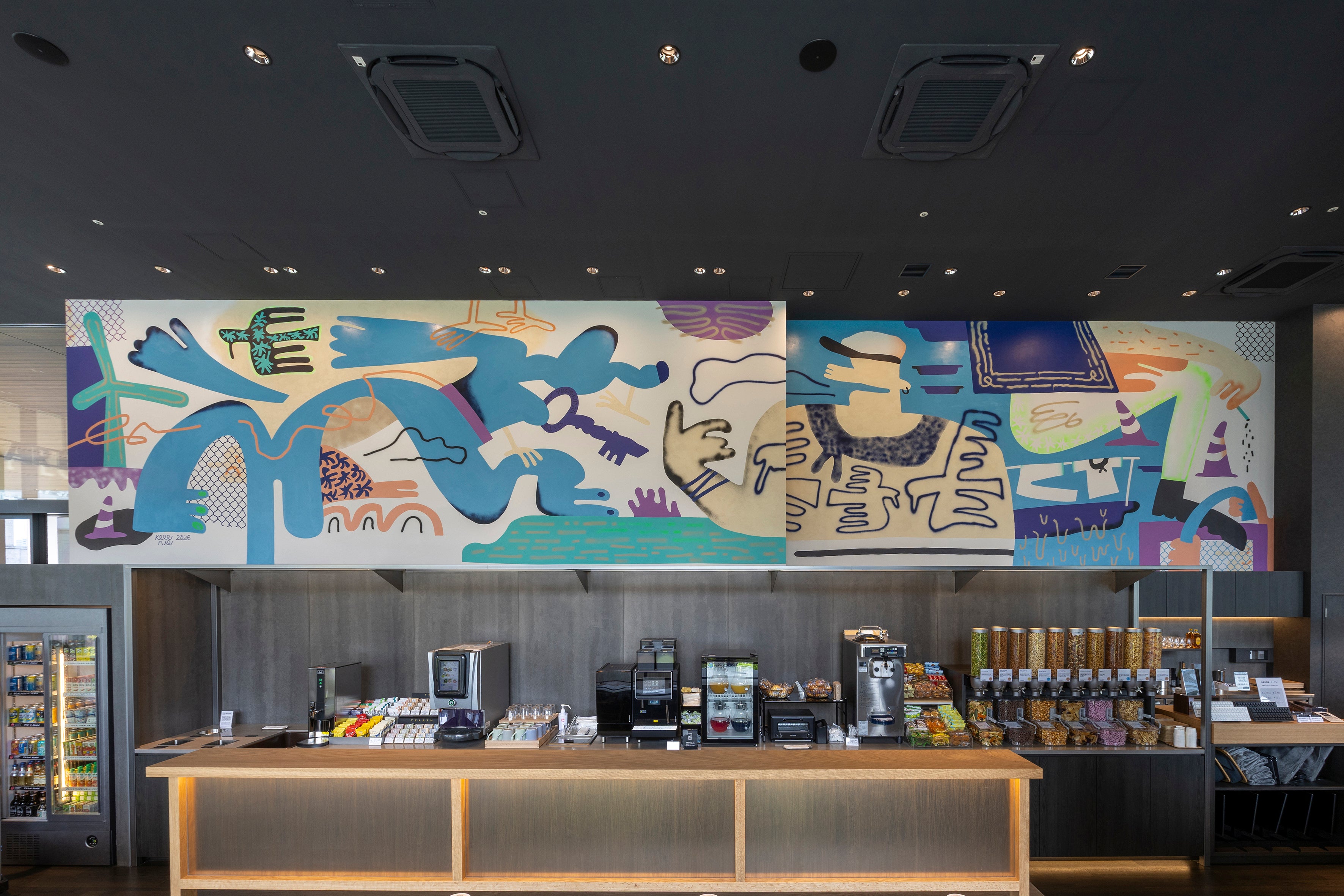 ラウンジエリアには、ペインティングを中心に、立体、コラージュやデジタルライブペインティングなど、媒体や形式を横断する多彩な表現で活動を展開するCCCアートラボの契約アーティスト・Keeenue(キーニュ)の壁画作品を展示します。横浜に位置する本店舗に合わせて制作した全長19mにもわたる特別な作品です。