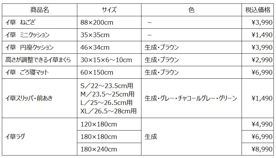 今年は、昨年も好評だった「イ草 円座クッション」や「高さが調整できるイ草まくら」、「イ草 ごろ寝マット」などのほか、新たに「イ草 ねござ」と「イ草 ミニクッション」を発売します。