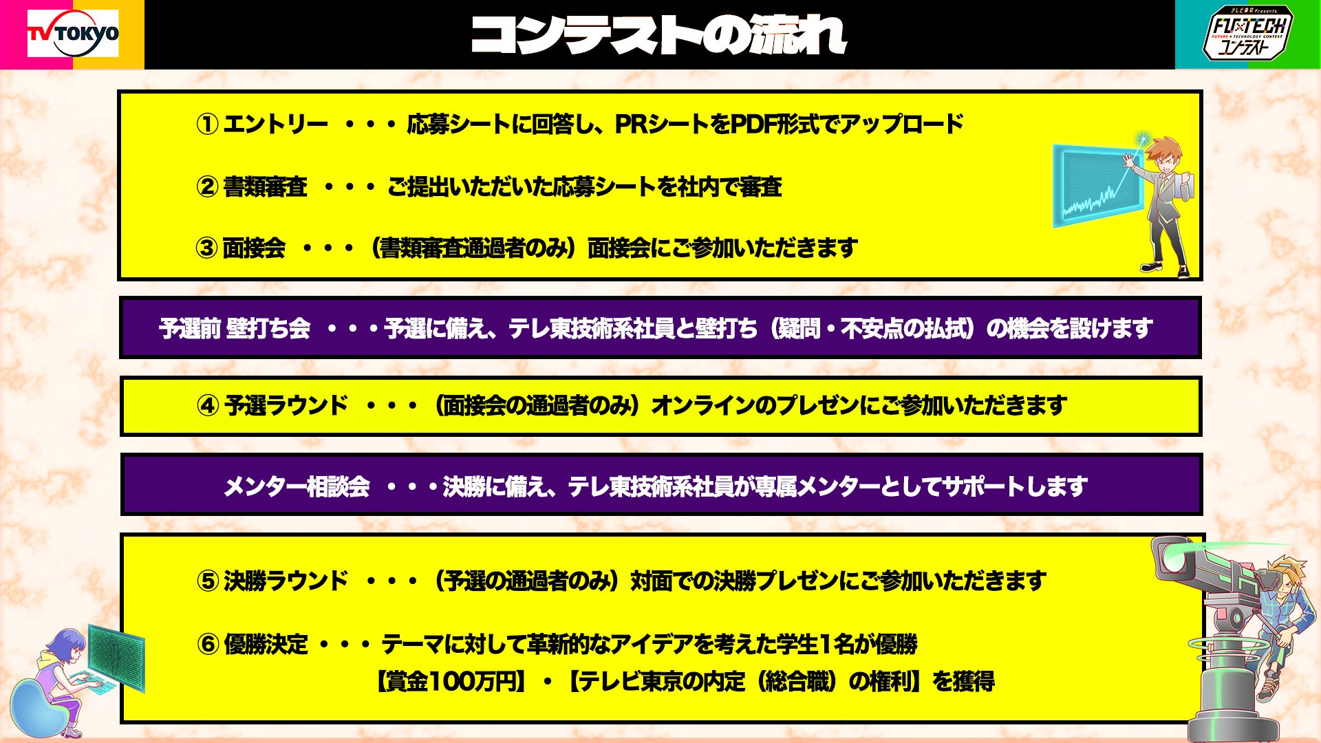 コンテストの名称は『FU×TECH(Future×Technology)コンテスト』で、AIやブロックチェーン、XRなどの様々なテクノロジーやデータマーケティングなどを駆使して、テレビ東京が直面する「課題」を解決したり、テレビ東京の「コンテンツ制作や事業、収益、業務の効率化」に新たな可能性を切り拓くアイデアなどを競うものです。テレビ東京の未来を形作るような革新的なアイデアをプレゼンした学生(1名)が 本コンテストの優勝者となり、賞金100万円および2025年度4月にテレビ東京に入社する権利(内定・総合職)を手に入れます。