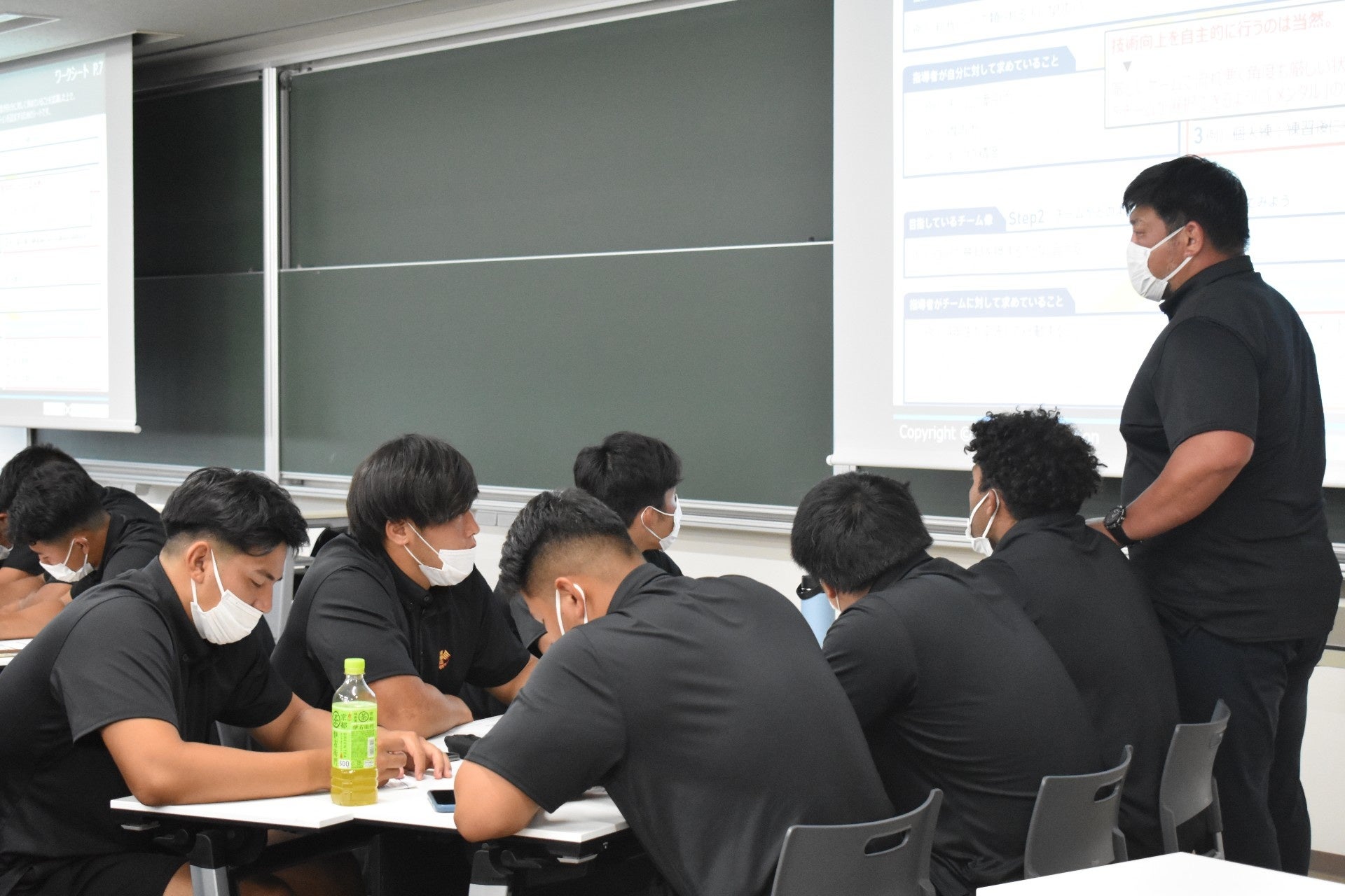 なでしこジャパンがワールドカップで優勝した時に発揮された「主体性」のエピソードを動画で紹介し、能力の理解を深めました。また、「主体性」が競技生活だけでなく、学生生活はもちろん社会に出た後にも求められている能力であることを、具体例を交えて説明しました。