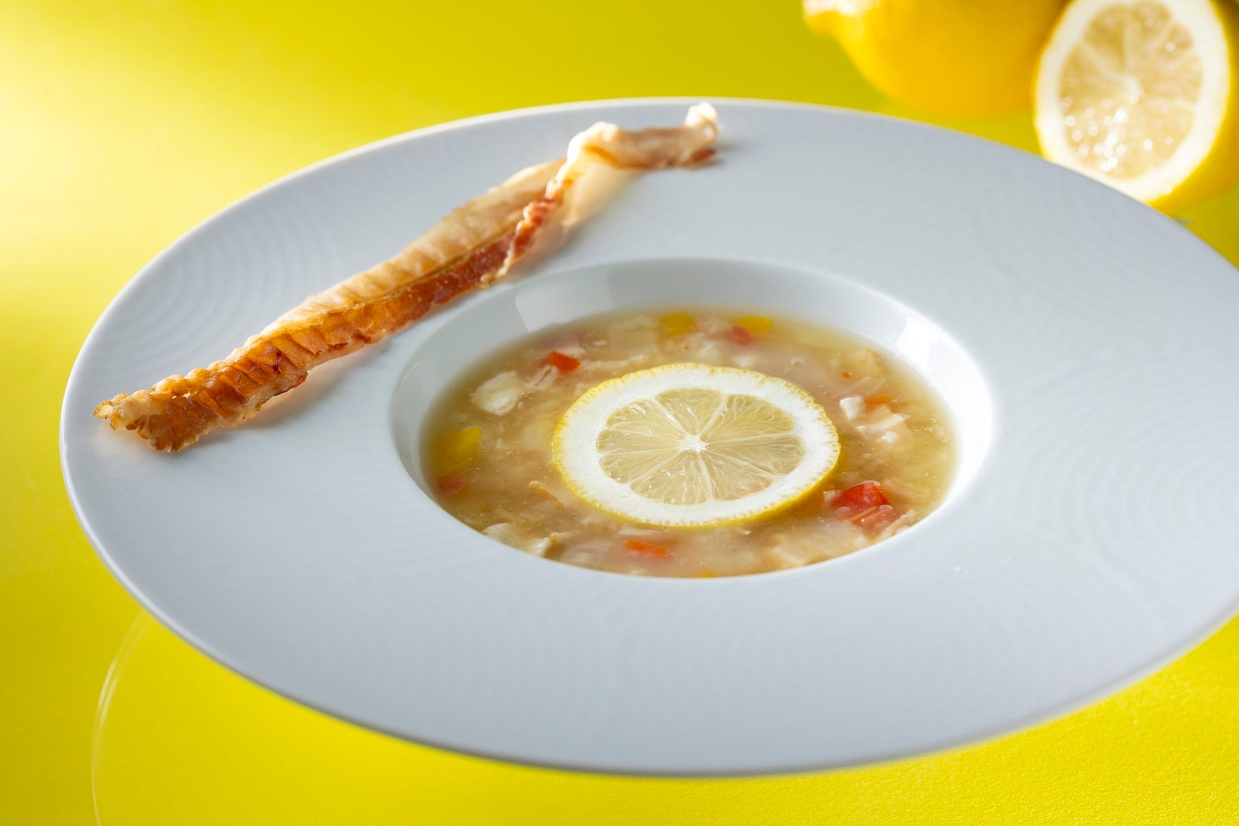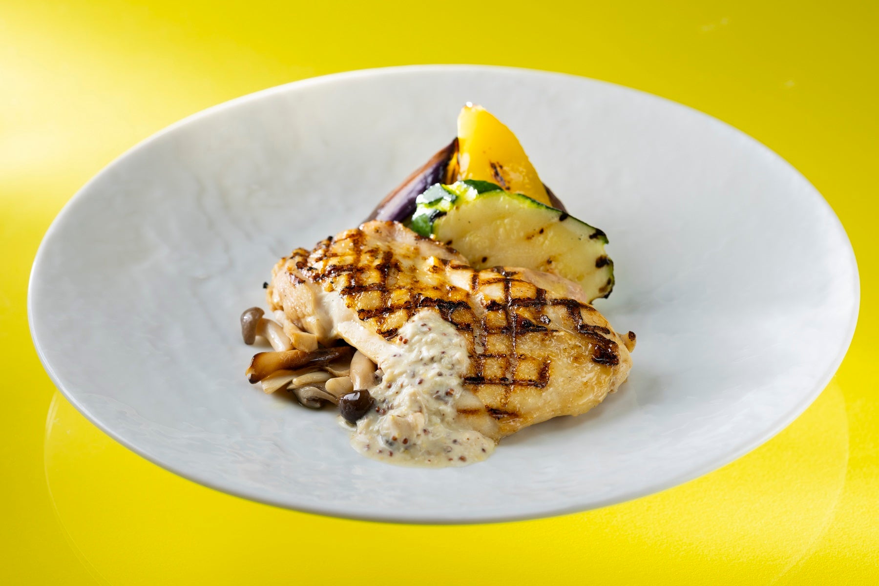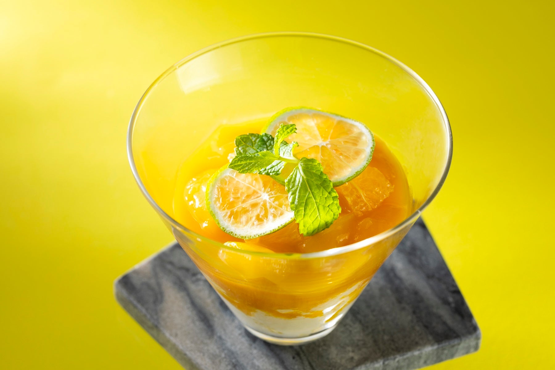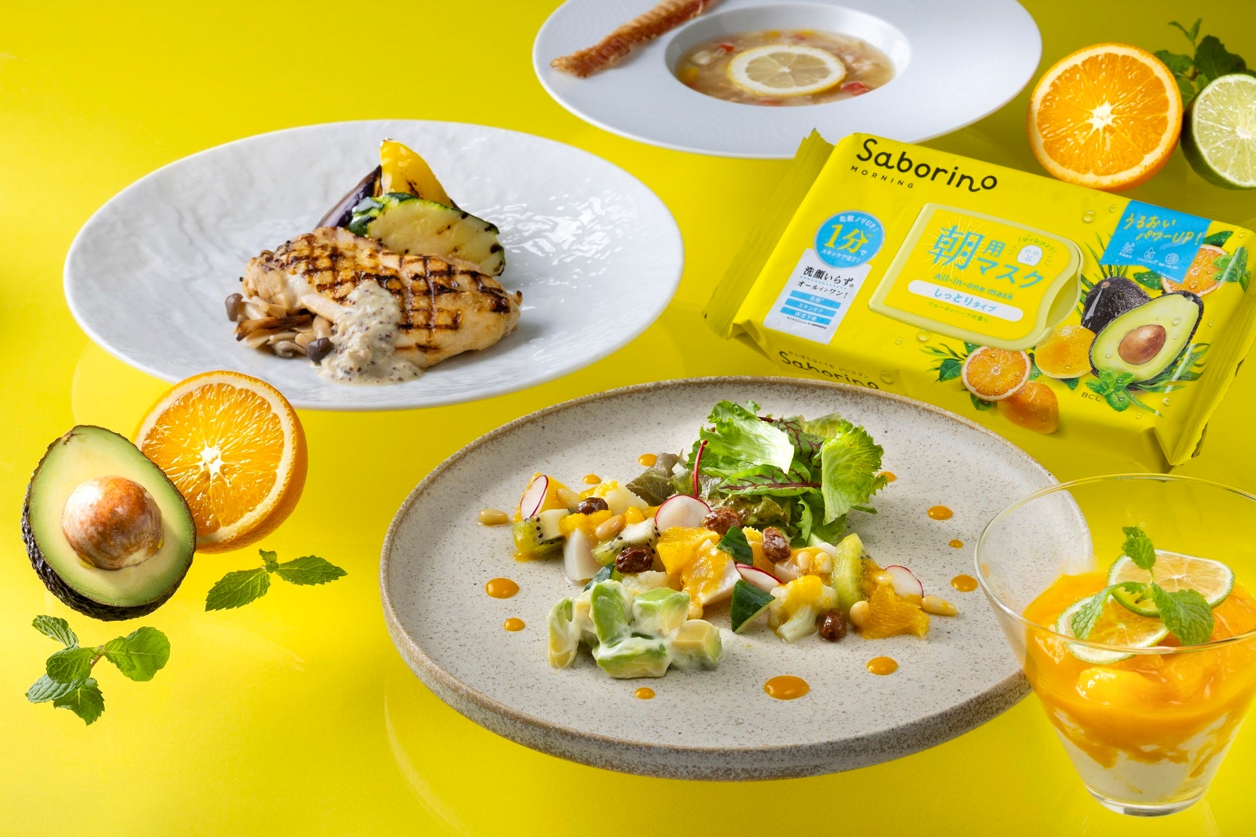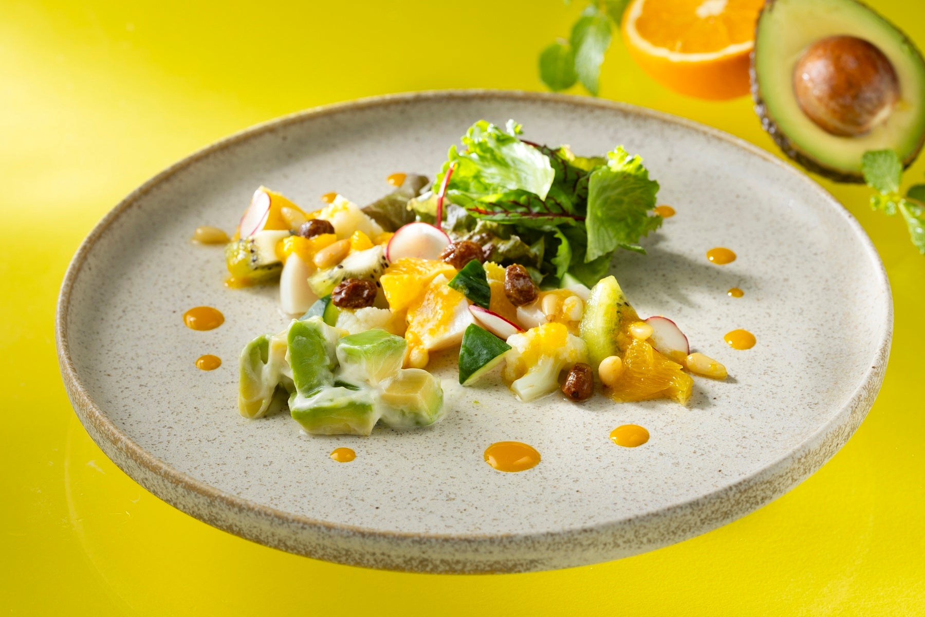 今回のランチメニューは、「サボリーノ」の黄色いパッケージから着想を得て、印象的に描かれているアボカドやオレンジなどを取り入れ、料理の随所に黄色のアクセントを加えています。華やかな前菜には、アボカドを加えたセビーチェと、爽やかな酸味のキウイフルーツやオレンジを組み合わせ、色鮮やかに盛り付けました。スープは柚子の香りが立つ、すっきりとした味わいに仕上げています。メインは3種の中からお好きな一品を選べるグリル料理をご用意し、デザートにはさっぱりとしたみかんを取り入れるなど、目で見て、香りを感じ、味わうことで五感を満たす内容になっています。