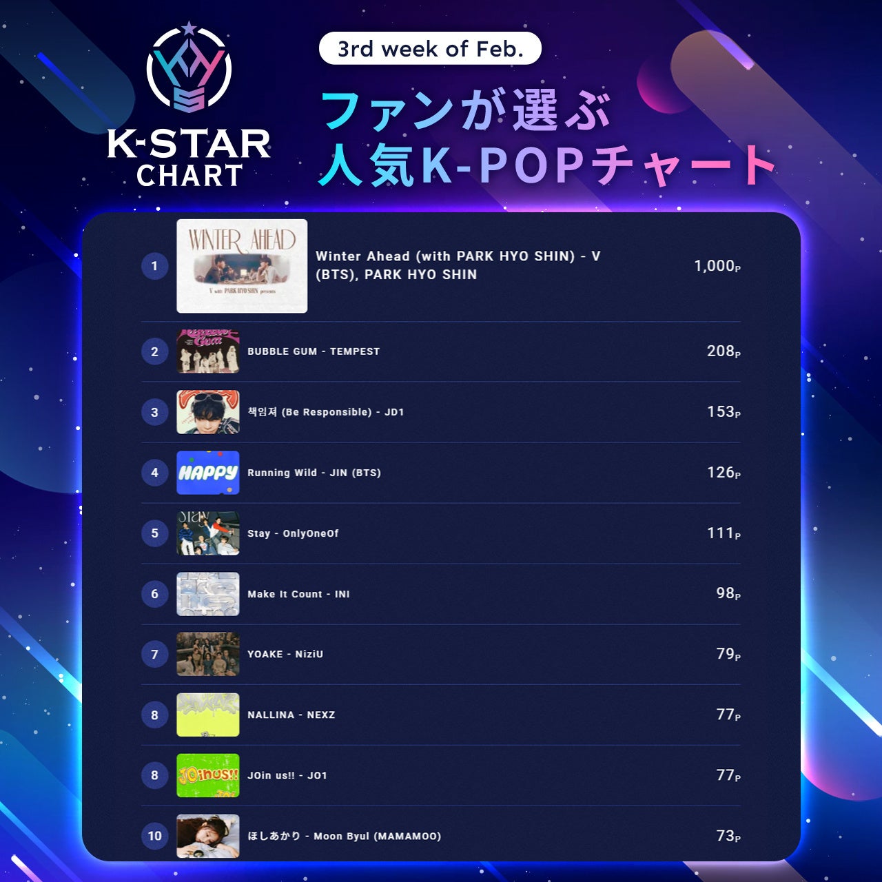『K-STAR CHART presents POP-K TOP10 Friday』2月21日(金)の放送回において、10位にMoon Byul(MAMAMOO)の「ほしあかり」、5位にOnlyOneOfの「Stay」が初登場ランクインし番組内で放送されました。
