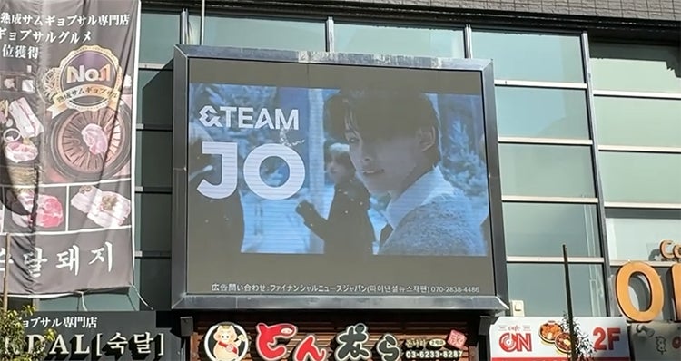 2025年2月3日(月)~2月9日(日)での期間で開催した「[K-STAR BOARD投票] 最高の「上海ロマンス・チャレンジ」のアイドルは?の投票において1位に選ばれた&TEAMのJOさんの応援広告が、新大久保のK-PLAZA 1号館の屋外ビジョンで上映されております。