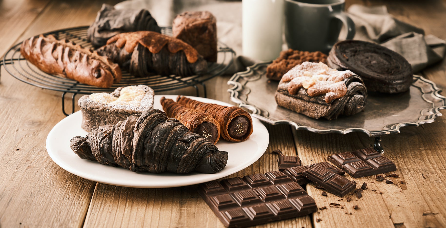 トラディション生地にブラックココアを練りこみ、2種類のチョコを巻き込み焼き上げた「ショコラバゲット」。軽くリベイクすることで、上品な甘さがさらに広がります。