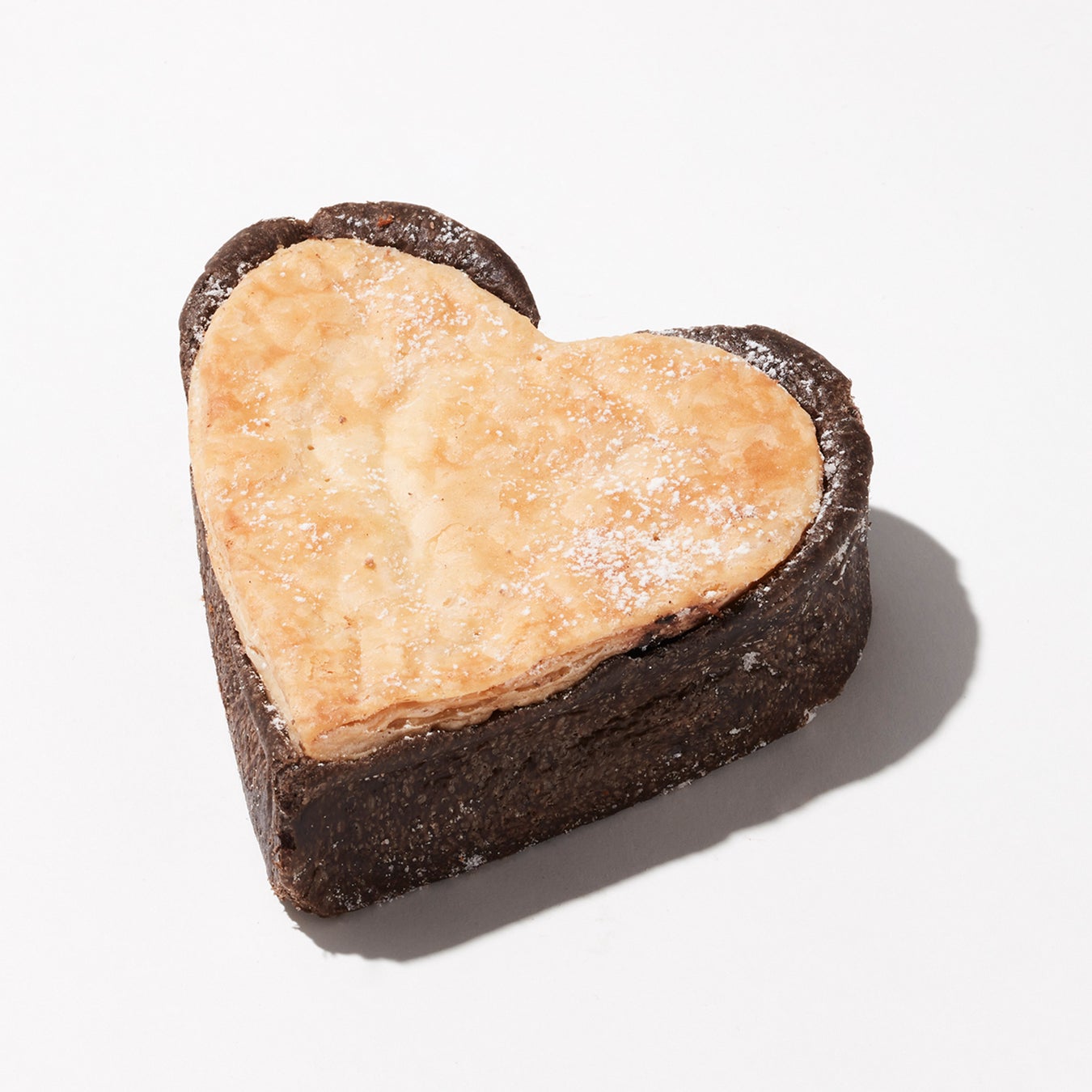 ドライフルーツ入りのココア生地でミルクチョコを包み、パイ生地と合わせてかわいいハート型に。