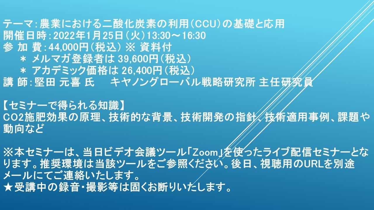 先端技術情報や市場情報を提供している(株)シーエムシー・リサーチ(千代田区神田錦町: https://cmcre.com/ )では、 各種材料・化学品などの市場動向・技術動向のセミナーや書籍発行を行っておりますが、 このたび「農業における二酸化炭素の利用(CCU)の基礎と応用」と題するセミナーを、 講師に堅田 元喜 氏 キヤノングローバル戦略研究所 主任研究員)をお迎えし、2022年1月25日(火)13:30より、 ZOOMを利用したライブ配信で開催いたします。 受講料は、 一般:44,000円(税込)、 弊社メルマガ会員:39,600円(税込)、 アカデミック価格は26,400円(税込)となっております(資料付)。