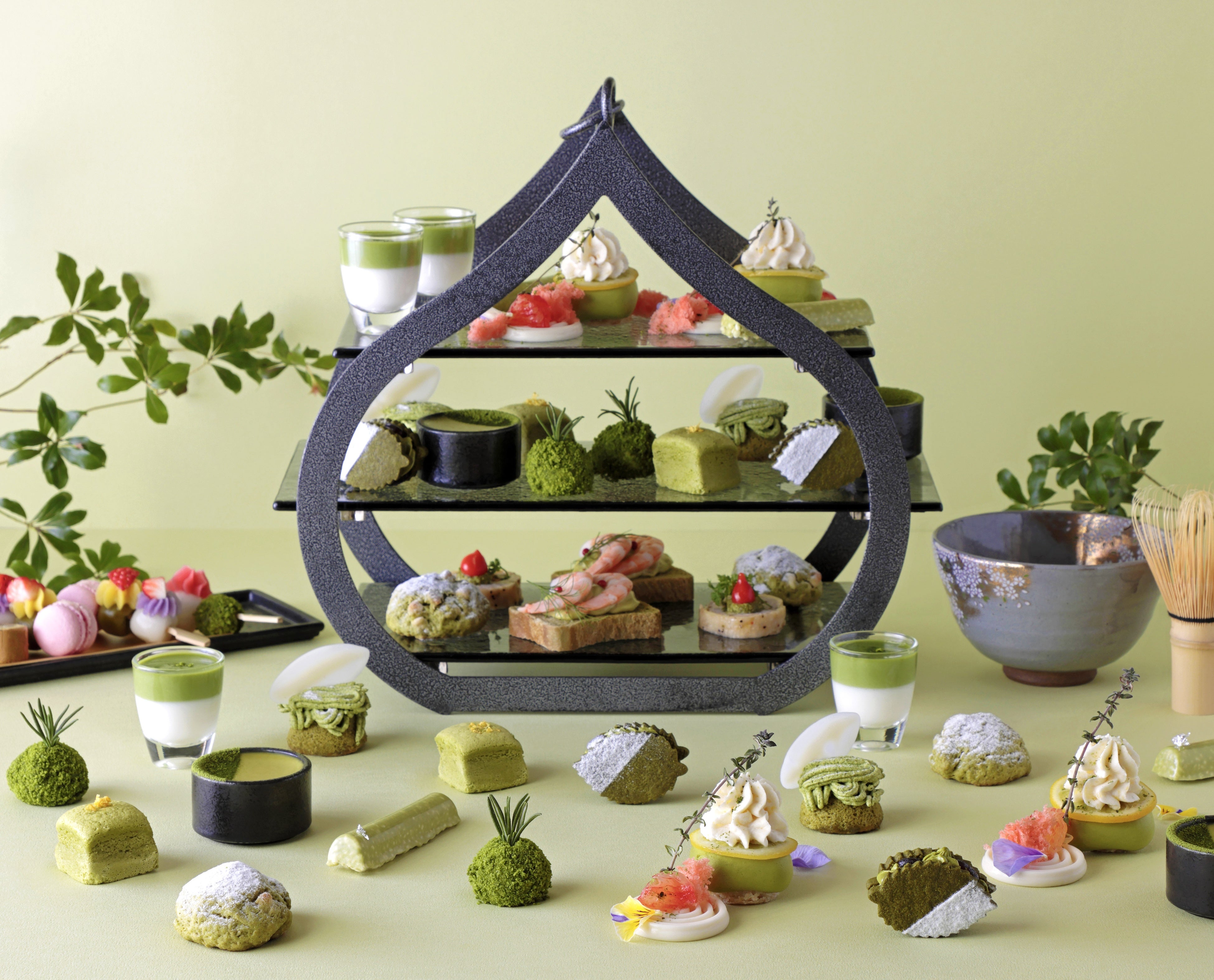 3段プレートには、日本庭園を手のひらサイズに表現した本物そっくりのお茶スイーツが勢ぞろい。まろやかなムースがとろける「苔玉に見立てた抹茶ムース」や、器で“ししおどし”をイメージし、底に和三盆カラメルソースを忍ばせた「抹茶のなめらかプリン」が登場。砂で水面の波やうねりを描く“枯山水”を表現した「抹茶とレモンのケーキ」は、抹茶とほのかに香る柑橘の組み合わせをお楽しみいただけます。