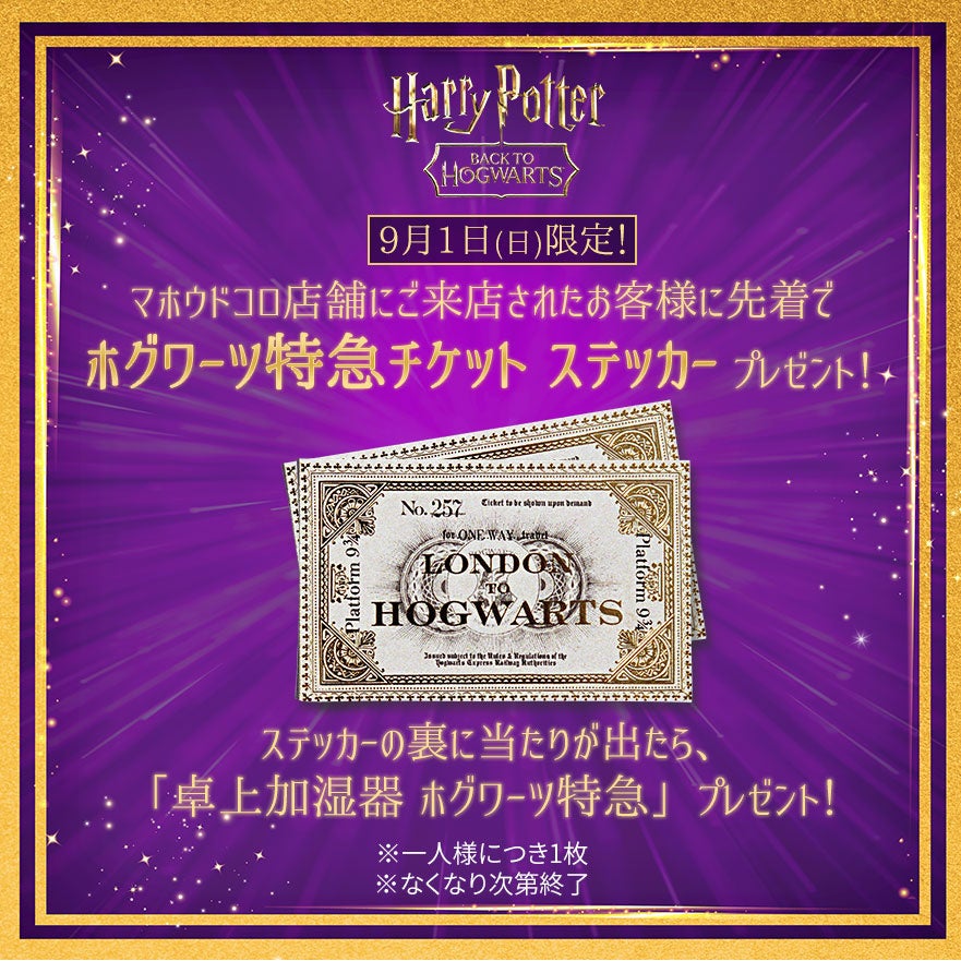 9月1日(日)にハリー・ポッター マホウドコロ各店舗にご来店のお客さまへ、ホグワーツ特急チケットステッカーを先着でプレゼントいたします。さらに、ステッカー裏面に「当たりマーク」のあった方には、ホグワーツ特急の加湿器をプレゼント。また、チケット画像と指定ハッシュタグを付けてXに投稿すると、抽選で「ハリー・ポッター ホグワーツトラベルシリーズ トランクキャリーケース」が当たるダブルチャンスも実施します。