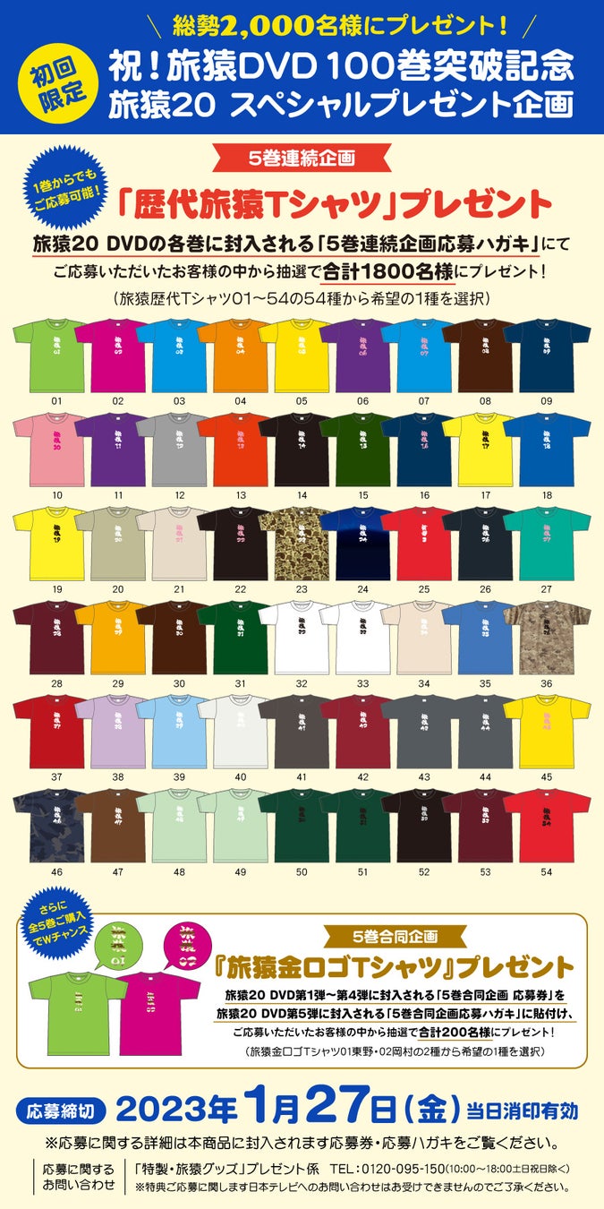 抽選で合計1800名様にプレゼント!(旅猿歴代Tシャツ01~54の54種から希望の1種を選択)