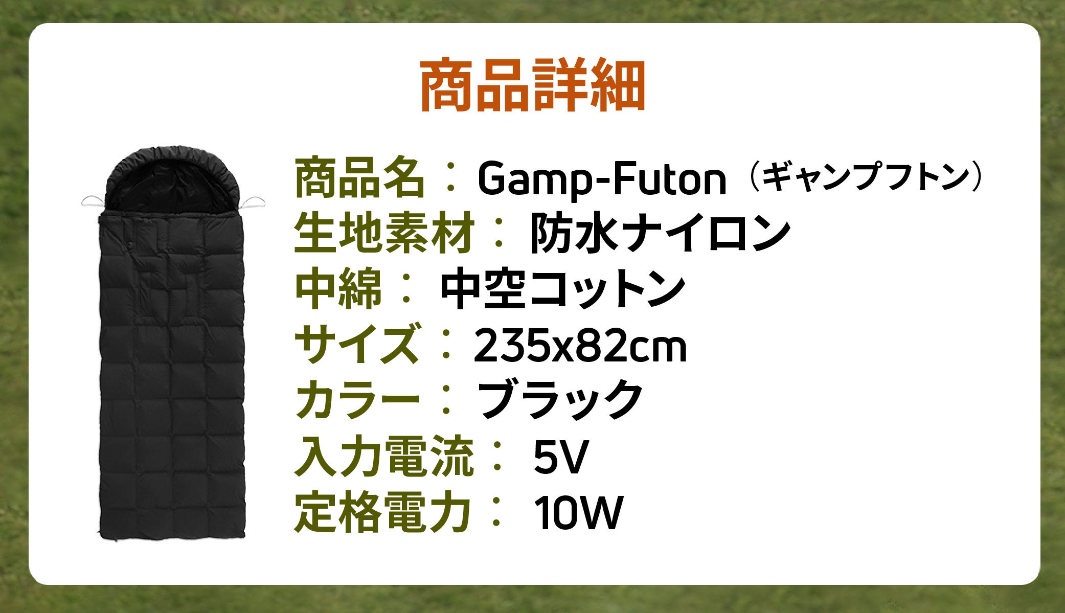 ワンタッチで3秒加熱!最新のテクノロジーを採用!アウトドアで大活躍な電熱寝袋「Gamp-Futon」をガジェットストア「MODERN g」で販売開始