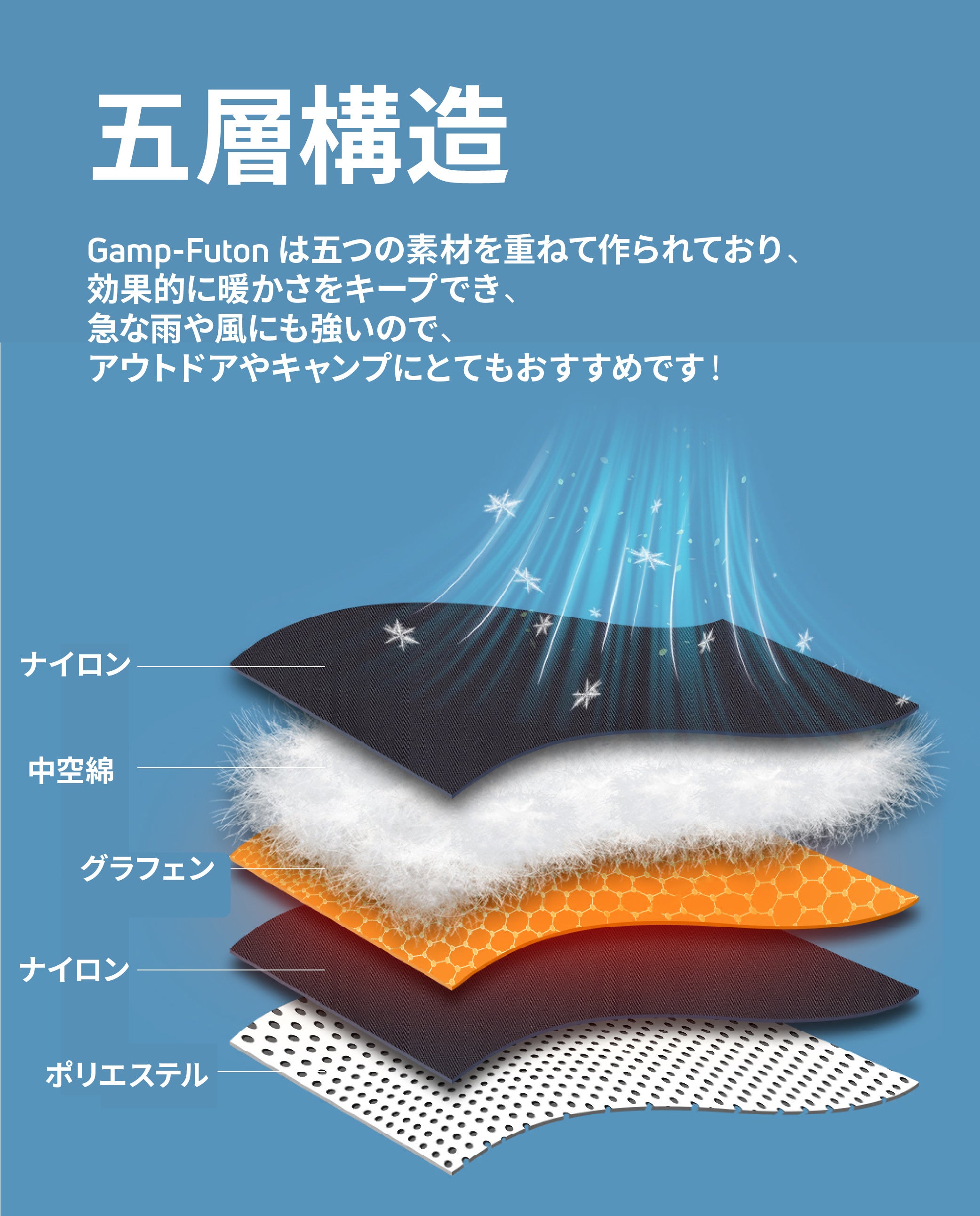 しかしGamp-Futonは保温性へのこだわりはもちろんのこと、防水防風仕様・電熱システム・マットレスピロー機能・ポータブル機能など、機能性も抜群!