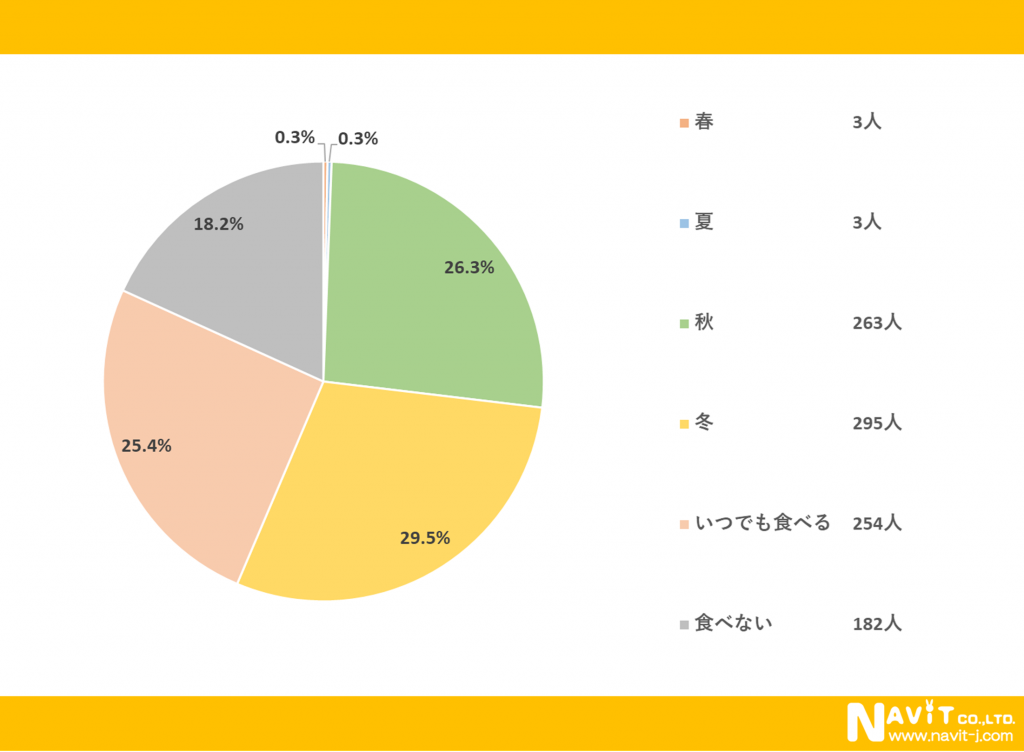 「どの季節に焼き芋を食べることが多いですか?」という質問については「冬」が29.5%、「秋」が26.3%、「いつでも食べる」が25.4%という順になりました。秋~冬にかけて食べている方が多いようですが、一年中食べられるので、「いつでも食べる」という方も多いようですね。