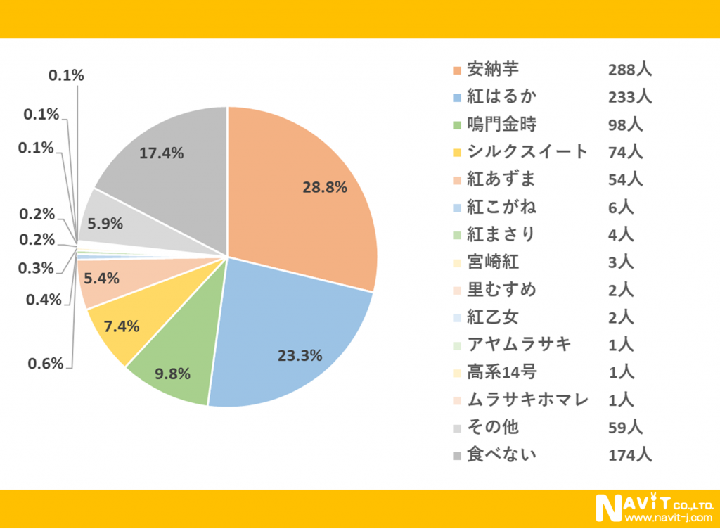 「どの品種の焼き芋が好きですか?」という質問については、「安納芋」が28.8%、「紅はるか」が23.3%、「鳴門金時」が9.8%という順になりました。「安納芋」や「紅はるか」が人気のようですね。