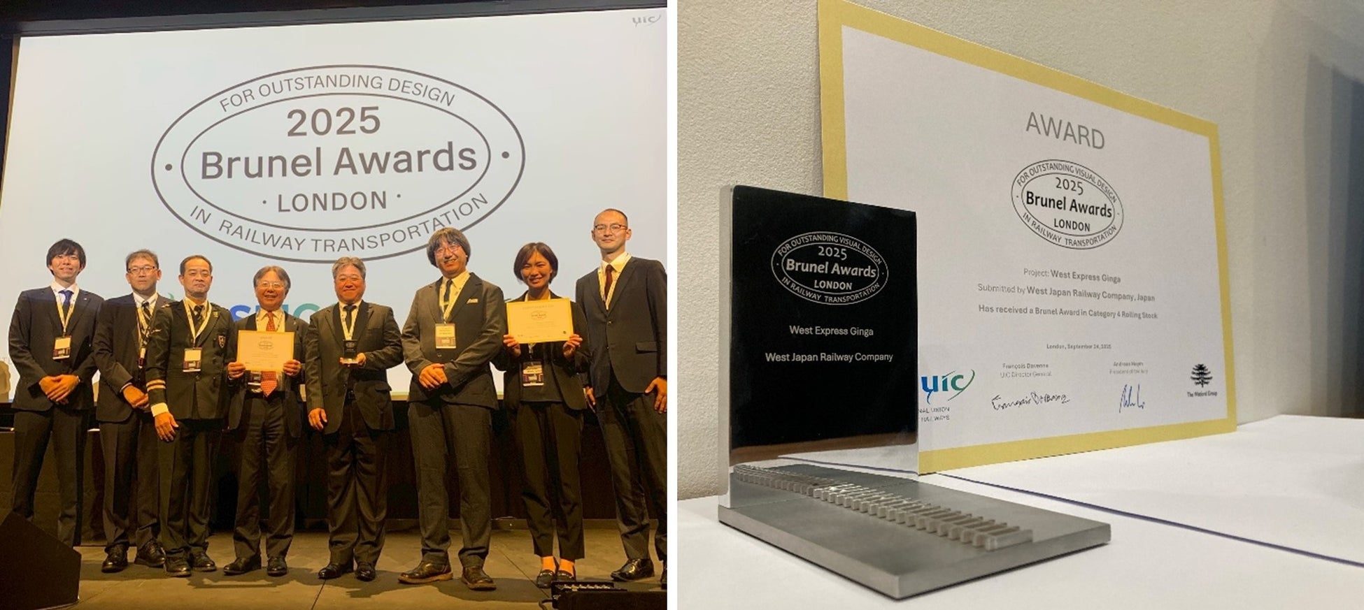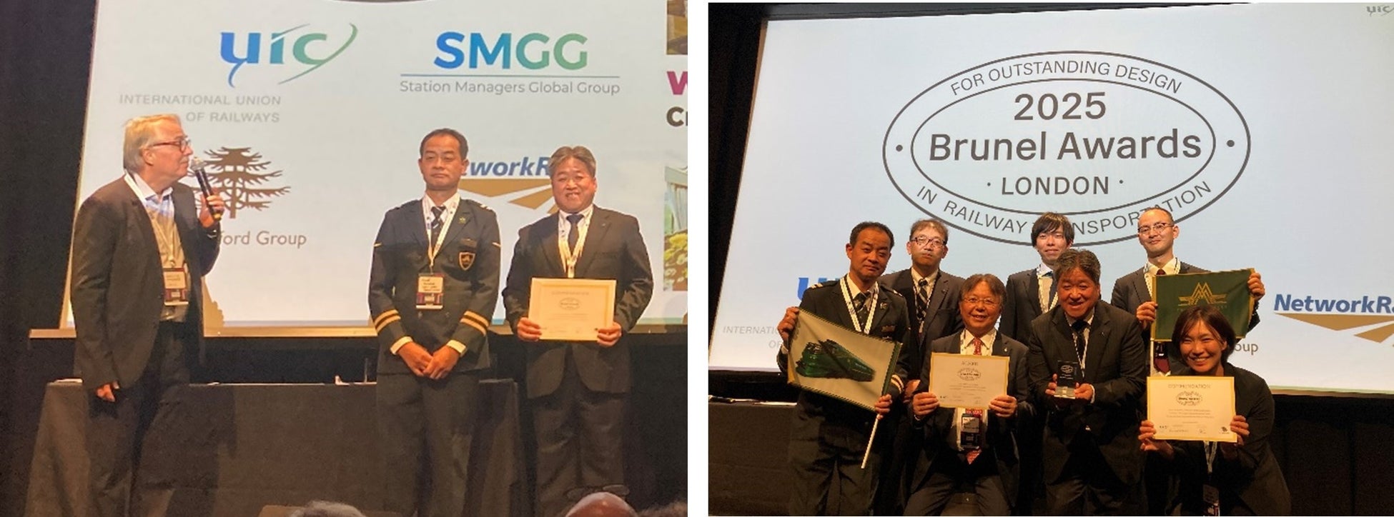 現地時間2025年9月24日(水)にイギリス ロンドンで開催され、受賞式では国際鉄道連合(UIC)のFrançois Davenne氏より、「ブルネル賞」優秀賞の盾(及び賞状)が手渡されました。