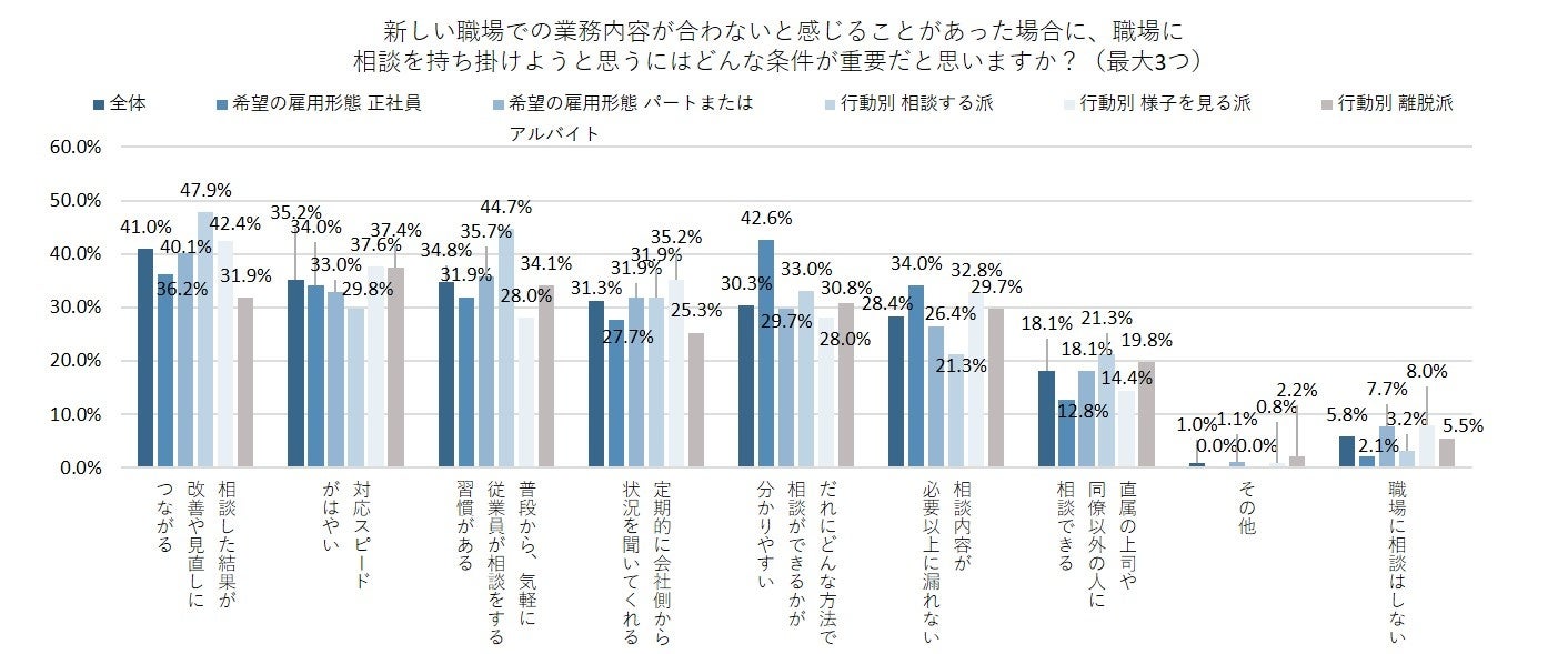 前項目の<業務内容が合わないと感じることがあった場合にどんな行動に移るか>で「社内のだれかに相談する」と「社外のだれかに相談する」を‟相談する派”、「仕事量や姿勢は変えず、様子を見る」を‟様子を見る派”、「仕事量や努力を抑えて、最小限の関与に留めるようにする」と「退職や転職活動に向けて動く」を‟離脱派”として集計した。‟相談する派”では「相談した結果が改善や見直しにつながる」と「普段から、気軽に従業員が相談をする習慣がある」が全体より高くなった。‟様子を見る派”では、「定期的に会社側から状況を聞いてくれる」が全体より高かった。‟離脱派”では、「対応スピードがはやい」が最も回答を集めた一方、「相談した結果が改善や見直しにつながる」が全体より低くなった。