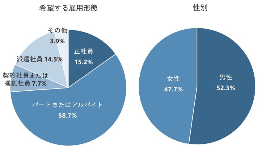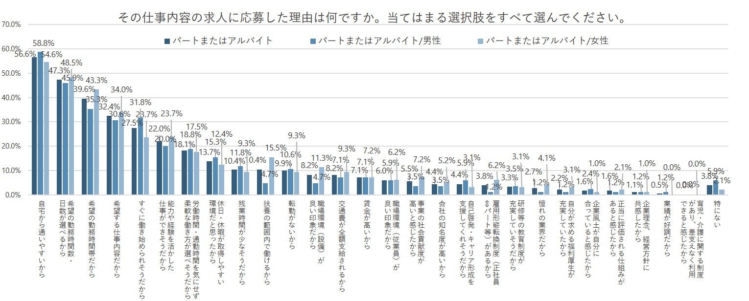 一方、女性のほうが男性よりも「扶養の範囲内で働けるから」が10.8pt、「希望の勤務時間帯だから」が8.0pt、「職場環境(設備)が良い印象だから」が6.6pt高くなった。制限のある中でも柔軟に勤められる仕事を探していることがわかる。