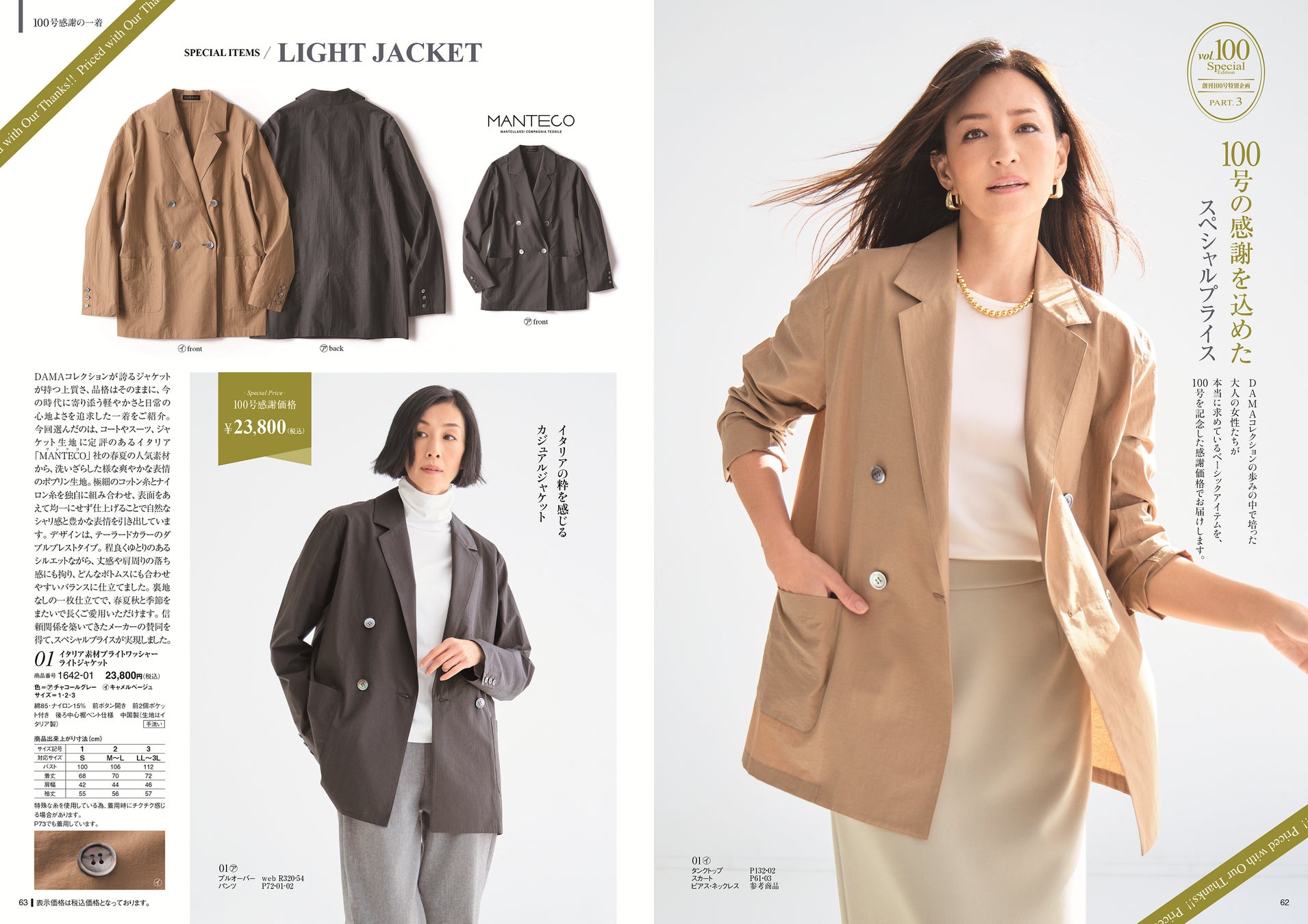 創刊以来大切にしてきたのは「素材力」「着やせと着映え」「豊富なサイズ」。そして100号まで進化してこられたのは、お客さまの厚い信頼と、口コミなどの真摯な声のお陰だと感じています。これからも「頼りになるブランド」と思っていただけるよう、装う楽しみを提案し、お洒落してお出かけしたくなるお手伝いができる存在でありたいと願っています。