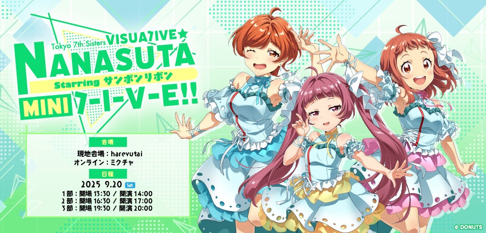 株式会社DONUTS(東京都渋谷区、代表取締役:西村啓成)がApp Store及びGoogle Playにて提供中のスマートフォン向けゲームアプリ『Tokyo 7th シスターズ THE SKY’S THE LIMIT』(略称:ナナシス)は、3Dバーチャルライブ「Tokyo 7th Sisters VISUALIVE(ビジュアライブ) NANASUTA MINI LIVE starring サンボンリボン」を2025年9月20日(土)に開催いたします。