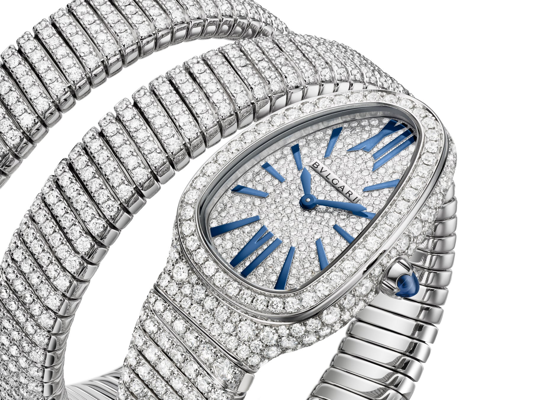 ホワイトゴールドにダイヤモンドをあしらった「セルペンティ インフィニティ」は、シングルツアーとダブルツアーで展開されます。ブルーの針とインデックスがダイヤモンドの輝きをさりげなく引き立てます。シングルツアーには978石のブリリアンカットダイヤモンド(約13.00ct)が、ダブルツアーには1344石のダイヤモンド(約20.00ct)がセットされ、ダイアル、ベゼル、ケース、そしてブレスレットのすべてのパーツに輝きを与えています。リューズにセットされたカボションカットのサファイアが、ケース全体に施されたダイヤモンドの魅力をさらに華やかなものにし、エレガントにナチュラルに手首を包み込みます。